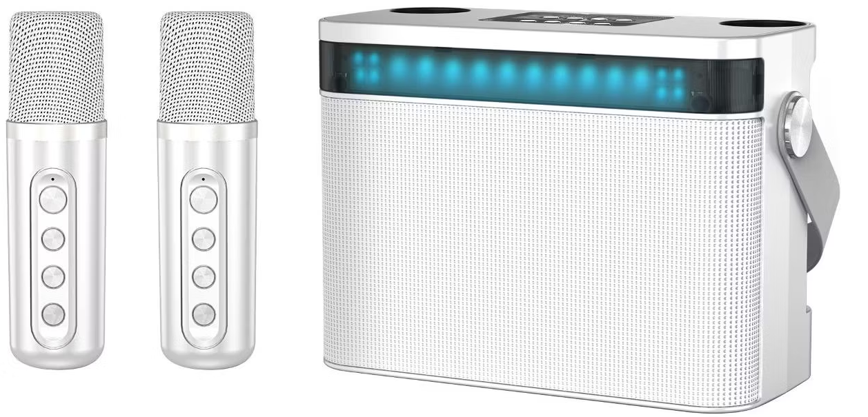 Эта караоке-система станет центром внимания на любом мероприятии. Встроенные световые эффекты создадут атмосферу настоящего концерта, а благодаря беспроводному подключению Bluetooth вы сможете легко воспроизводить любимые треки со своего смартфона или планшета. Два микрофона в комплекте позволят вам петь дуэтом, добавляя еще больше веселья и взаимодействия.