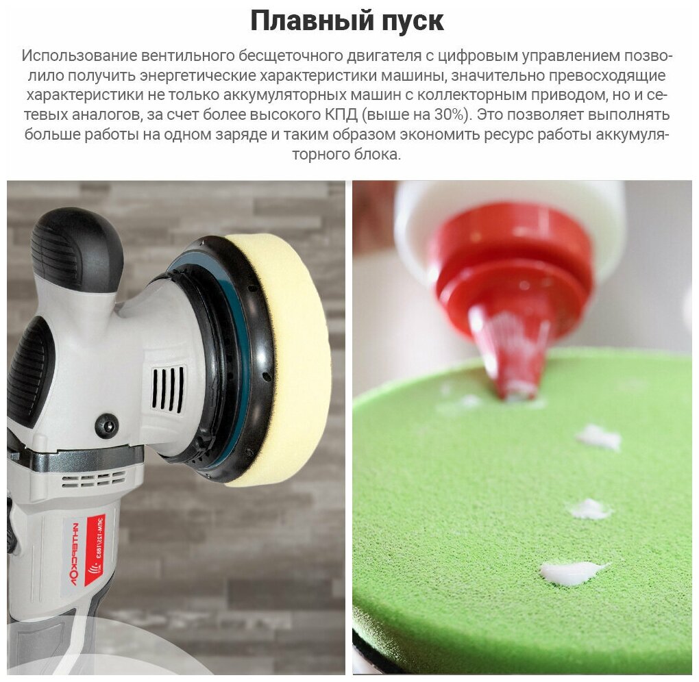 Эргономичный дизайн и удобная рукоятка позволяют комфортно работать даже в течение длительного времени. Продуманное управление обеспечивает точную настройку скорости вращения, что позволяет адаптировать инструмент под различные типы поверхностей и полировальных материалов.