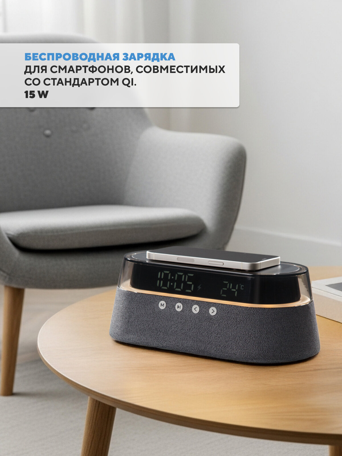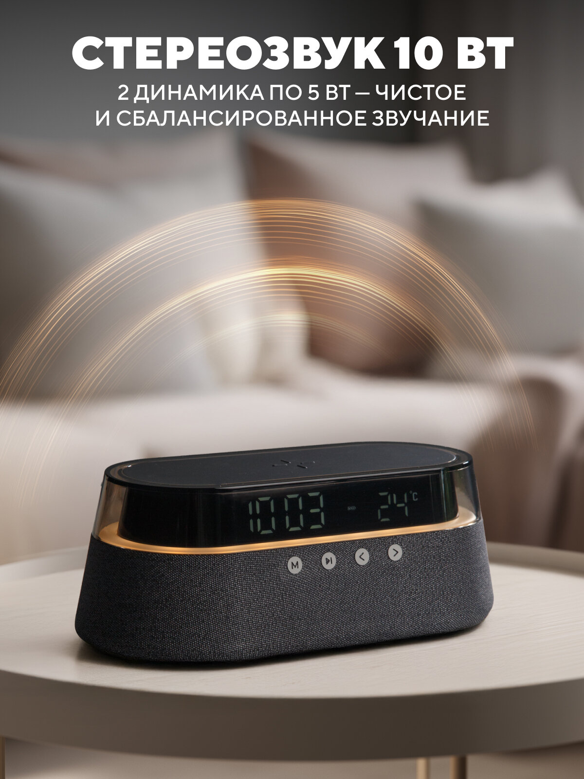 Представьте себе: вы возвращаетесь домой после долгого дня, включаете любимый плейлист, и мягкий свет ночника наполняет комнату теплом и уютом. BTA1212 легко создаст желаемую атмосферу благодаря встроенному ночнику с регулируемой яркостью. Забудьте о поиске розетки для зарядки телефона! Благодаря встроенной беспроводной зарядке вы сможете легко пополнить заряд своего смартфона, просто положив его на верхнюю панель колонки.