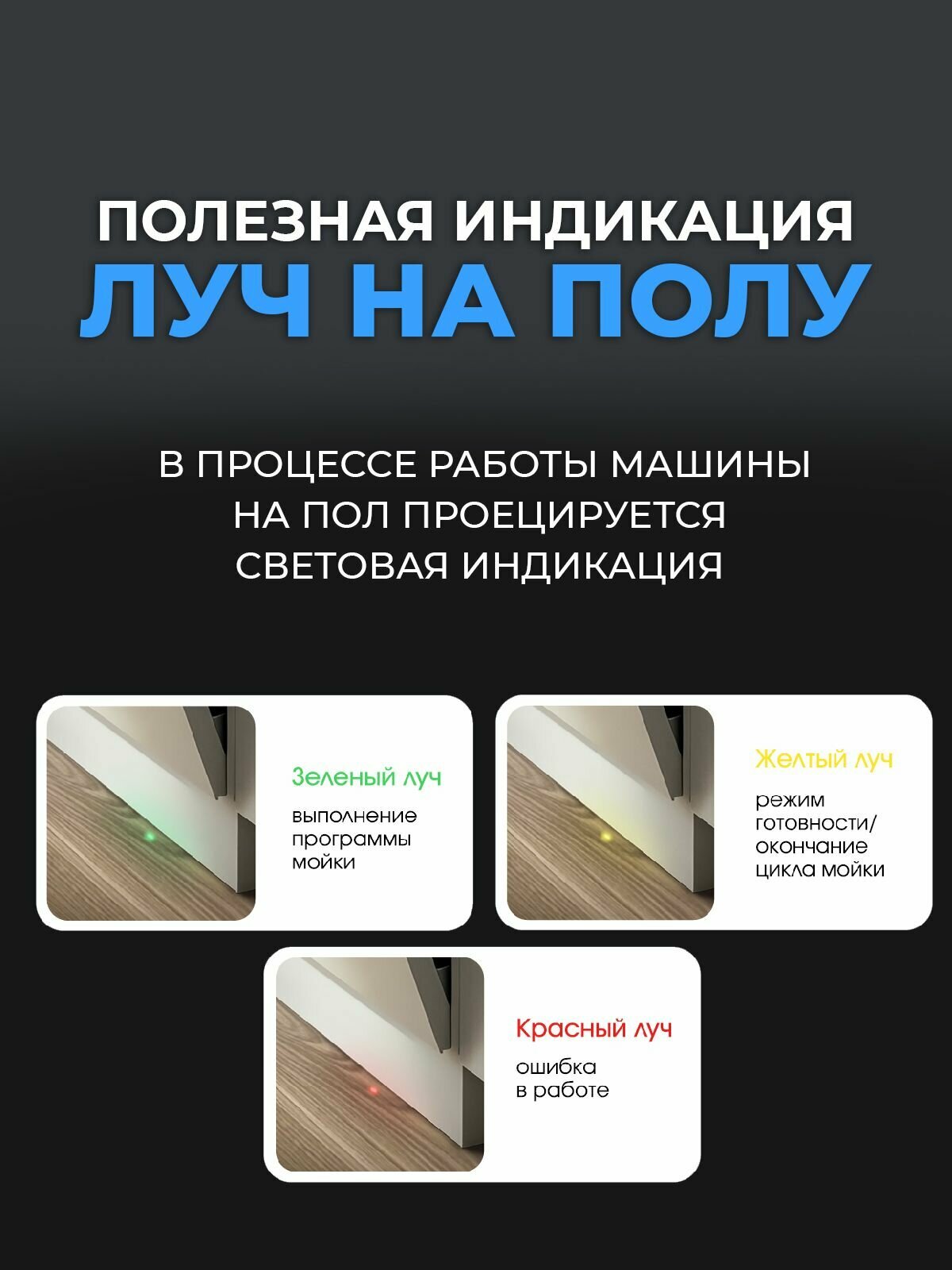 Функция "Луч на полу" информирует вас о ходе работы посудомоечной машины, отображая световой индикатор на полу. Это удобно и практично, позволяя вам быть в курсе текущего состояния программы без необходимости открывать дверцу.