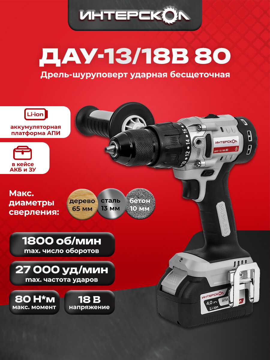 Ищете надежный и мощный инструмент для широкого спектра задач? Профессиональная ударная дрель-шуруповерт с бесщеточным двигателем Interskol ДАУ-13/18В - ваш идеальный выбор! Этот универсальный инструмент сочетает в себе функциональность дрели и шуруповерта, обеспечивая высокую производительность и долговечность.