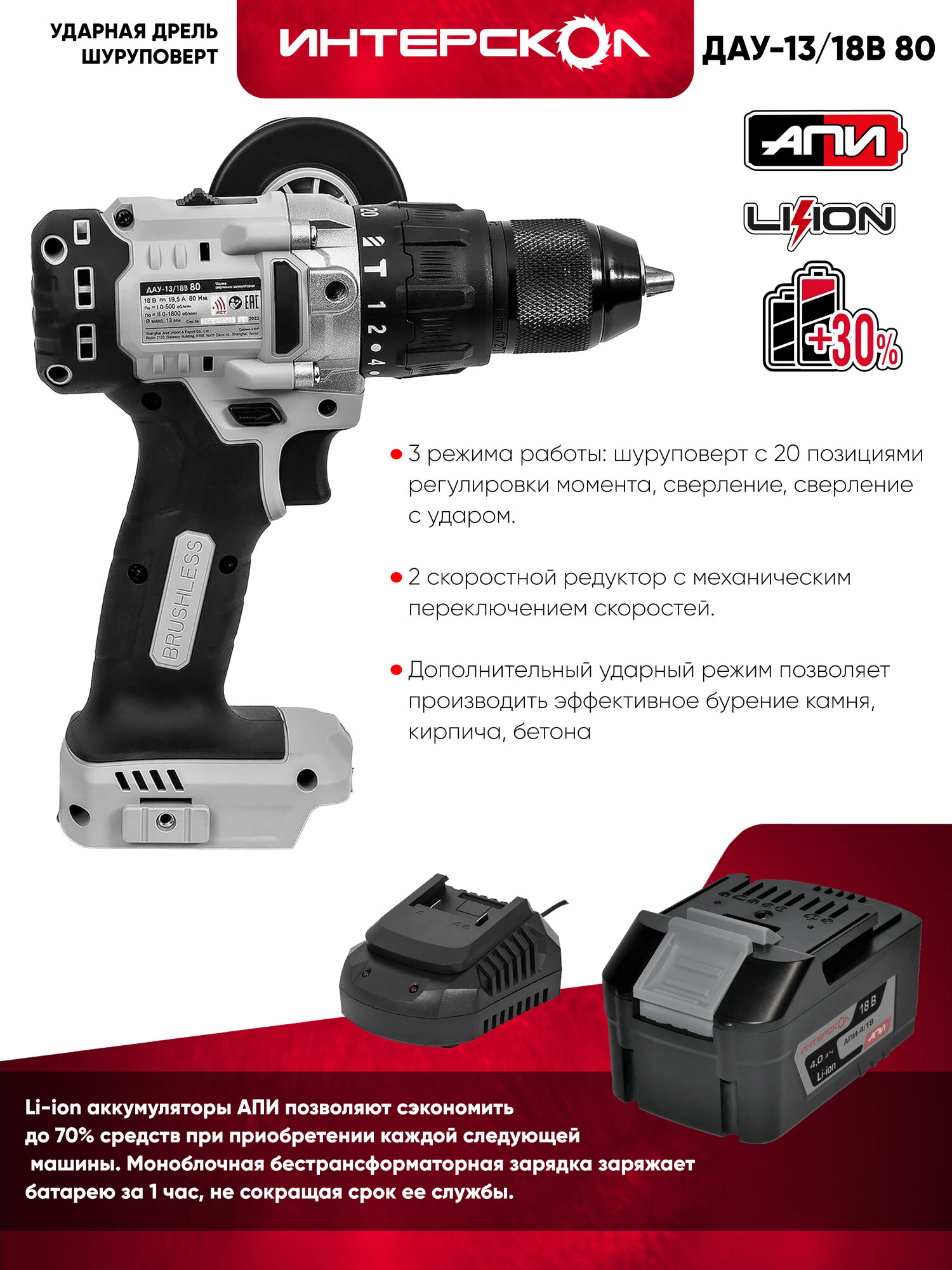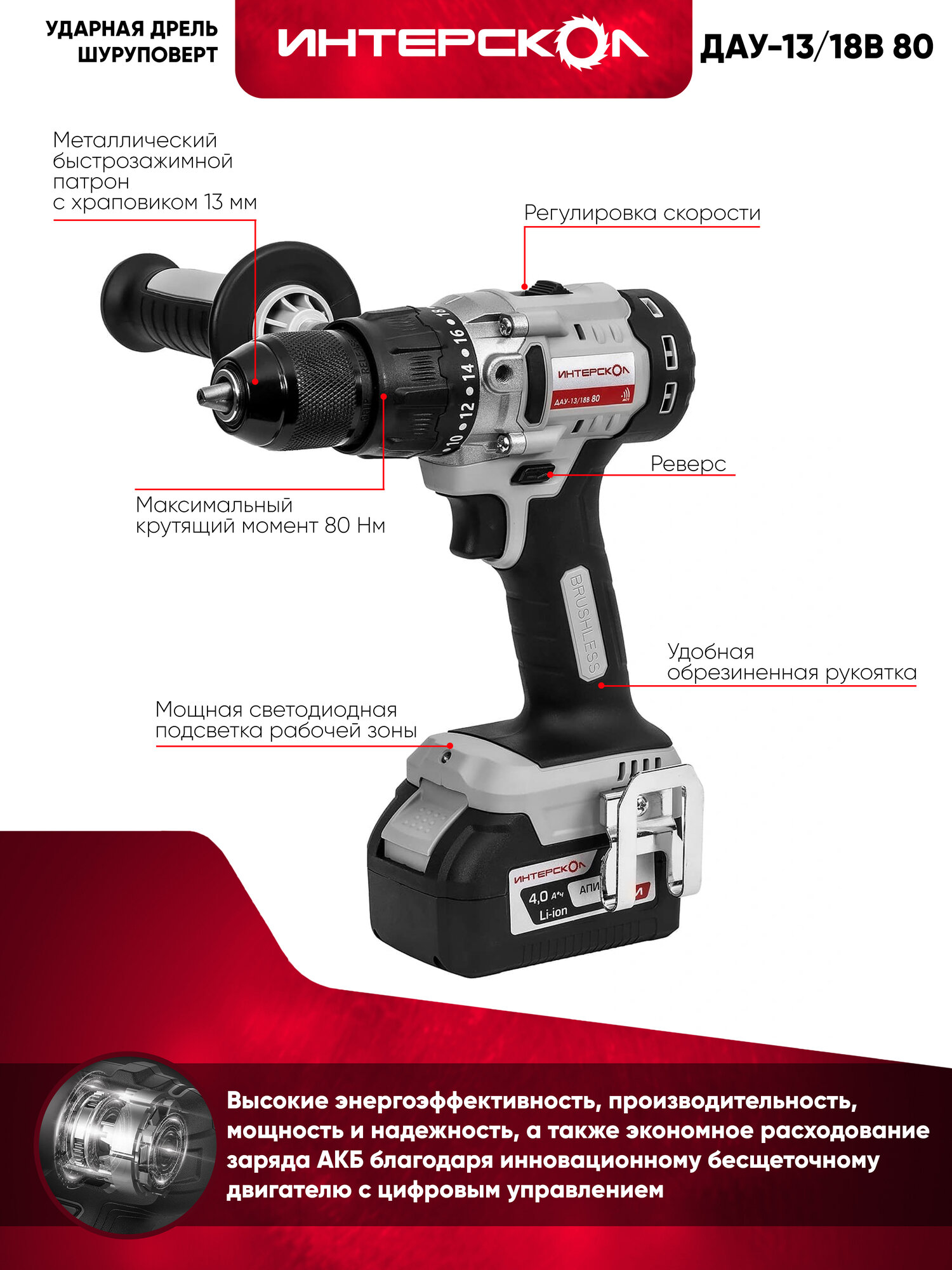 Закажите профессиональную ударную дрель-шуруповерт с бесщеточным двигателем Interskol ДАУ-13/18В прямо сейчас и убедитесь в ее превосходстве!
