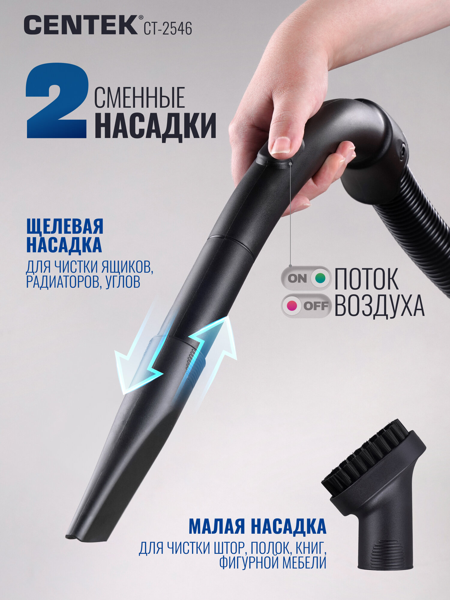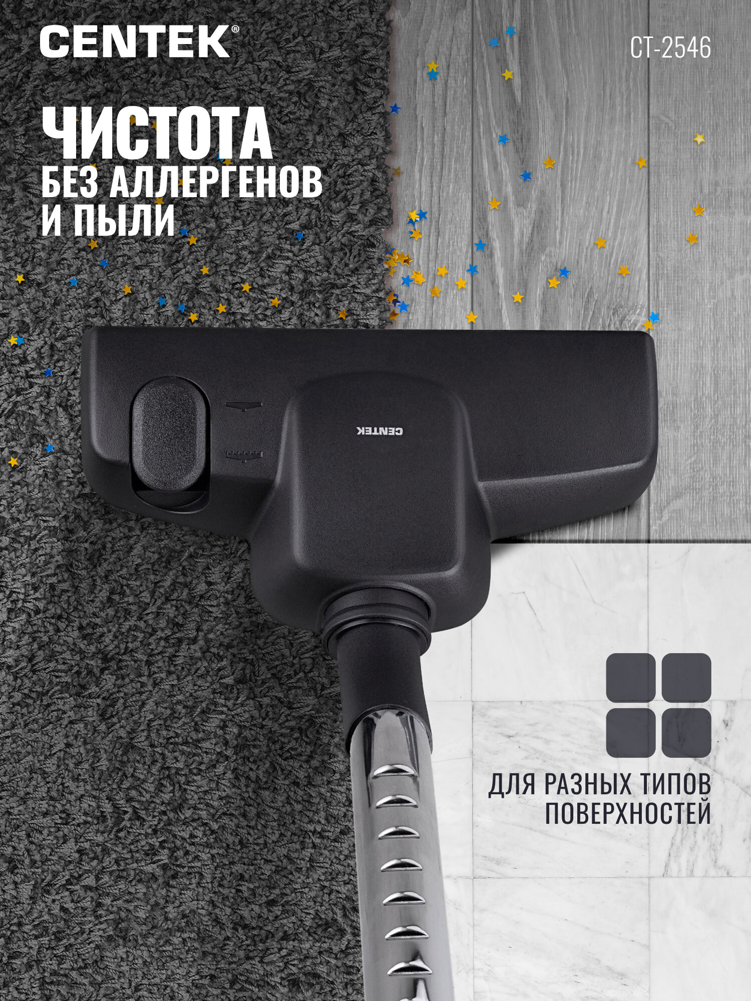 Комфорт в использовании – еще одно преимущество Centek CT-2546. Низкий уровень шума позволяет убирать в любое время, не беспокоя домочадцев. Эргономичный дизайн и удобные насадки обеспечивают легкую и эффективную уборку в труднодоступных местах.