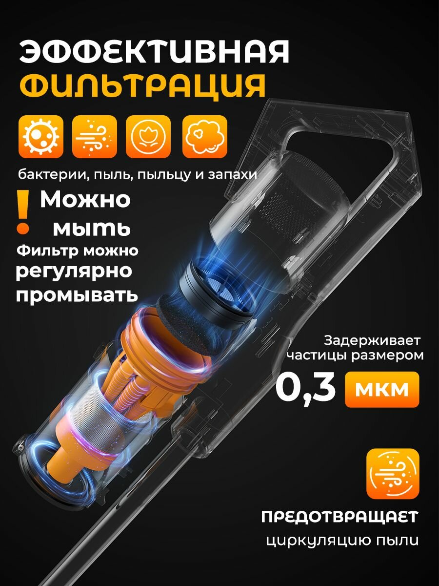 Забудьте о надоедливых проводах и ограничениях! Беспроводная конструкция пылесоса обеспечивает полную свободу движений и позволяет добраться до самых труднодоступных мест. Легкий вес и эргономичный дизайн делают уборку максимально комфортной и неутомительной.
