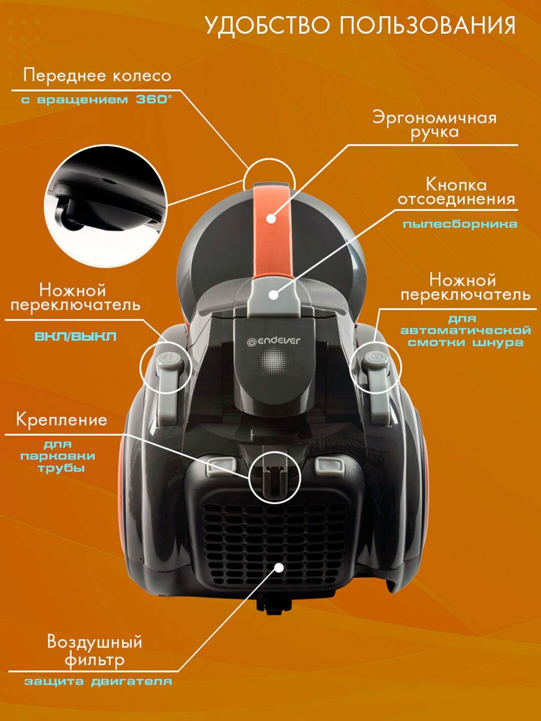 Endever SkyClean VC-650 также удобен в использовании. Он оснащен функцией автоматической смотки шнура, что значительно облегчает хранение и транспортировку. Вместительный пылесборник позволит вам убирать большие площади без необходимости частого опустошения.