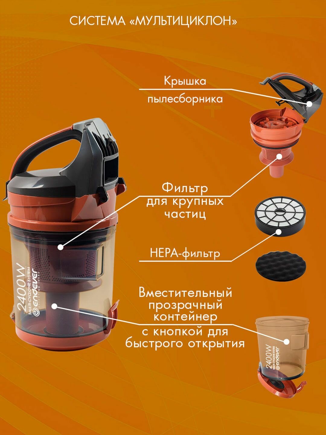 Благодаря передовой технологии циклонной фильтрации, Endever SkyClean VC-650 обеспечивает высокую эффективность уборки, отделяя пыль и мусор от воздуха. Вам больше не придется беспокоиться о засорении фильтров и потере мощности всасывания.