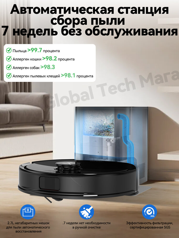 Удобная автостанция сбора пыли избавляет вас от необходимости часто опорожнять пылесборник. Просто наслаждайтесь чистотой, а робот сам позаботится о сборе мусора. Это особенно удобно для тех, у кого аллергия или домашние животные.