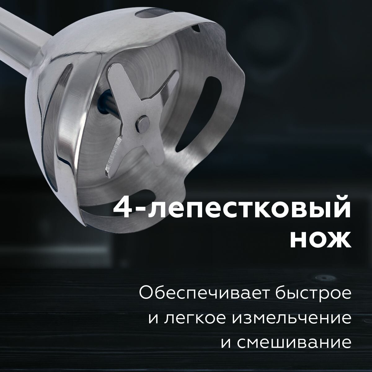 Мощный мотор обеспечивает эффективное и быстрое измельчение и смешивание ингредиентов. Благодаря ему вы сможете без труда приготовить смузи, супы-пюре, соусы, детское питание и многое другое. Функция турборежима позволяет моментально увеличить мощность для достижения идеальной консистенции.