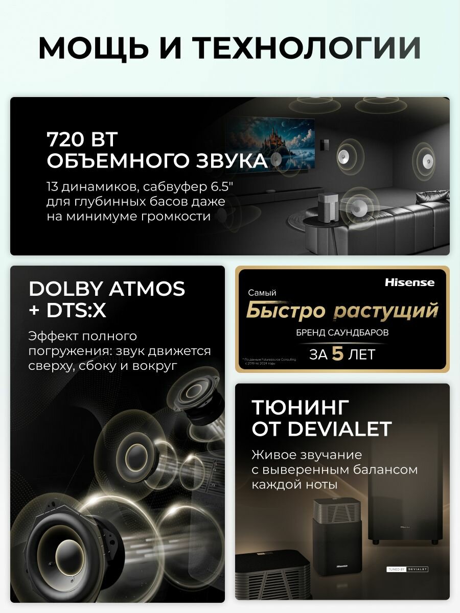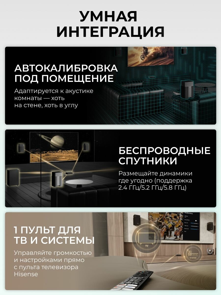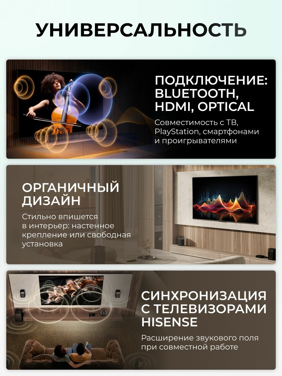 Почувствуйте разницу! Погрузитесь в мир кристально чистого, мощного и объемного звука с саундбаром Hisense HT-Saturn 412. Это идеальное решение для тех, кто ценит высокое качество звука и комфорт.