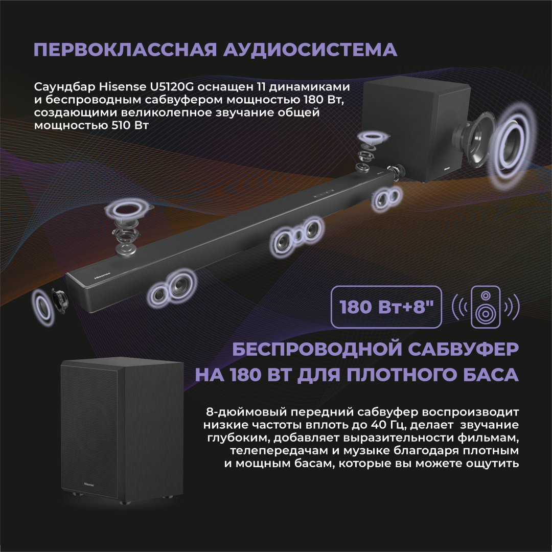 Окунитесь в мир кристально чистого звука и глубоких басов с беспроводным саундбаром Hisense 34U5120G34. Этот элегантный и мощный комплект, состоящий из саундбара и сабвуфера, преобразит ваш домашний кинотеатр, обеспечивая захватывающее звучание, которое заполнит все пространство.