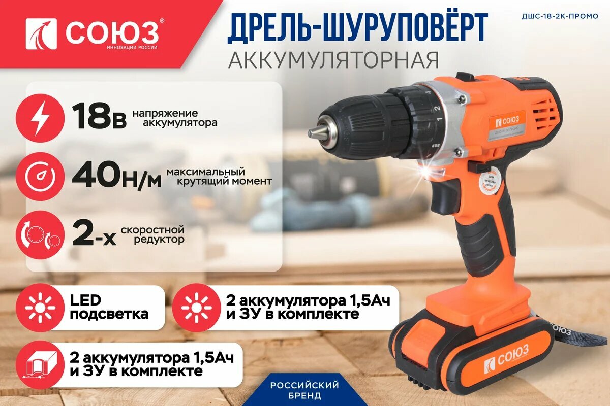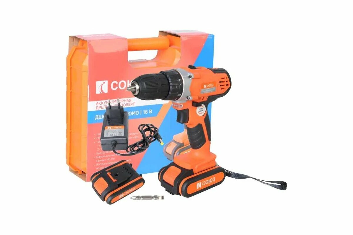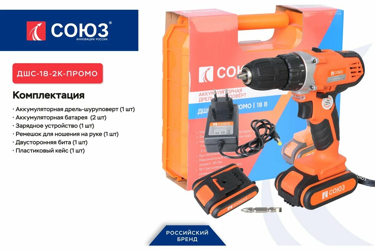 Шуруповерт СОЮЗ ДШС-18-2К-ПРОМО, аккумуляторный, 2-скоростной, с кейсом