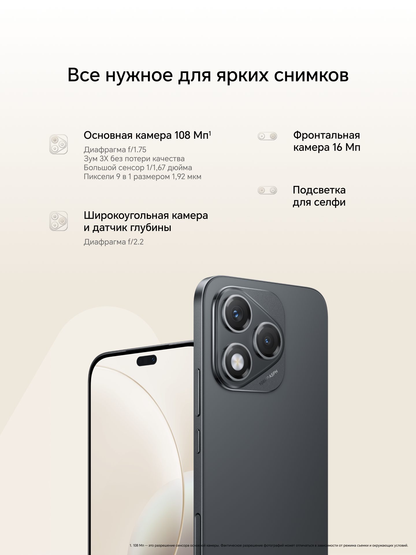 Черный цвет придает устройству элегантность и универсальность. Он отлично сочетается с любым стилем и подчеркивает ваш вкус. Honor 400 Lite – это не просто смартфон, это стильный аксессуар, который дополнит ваш образ.