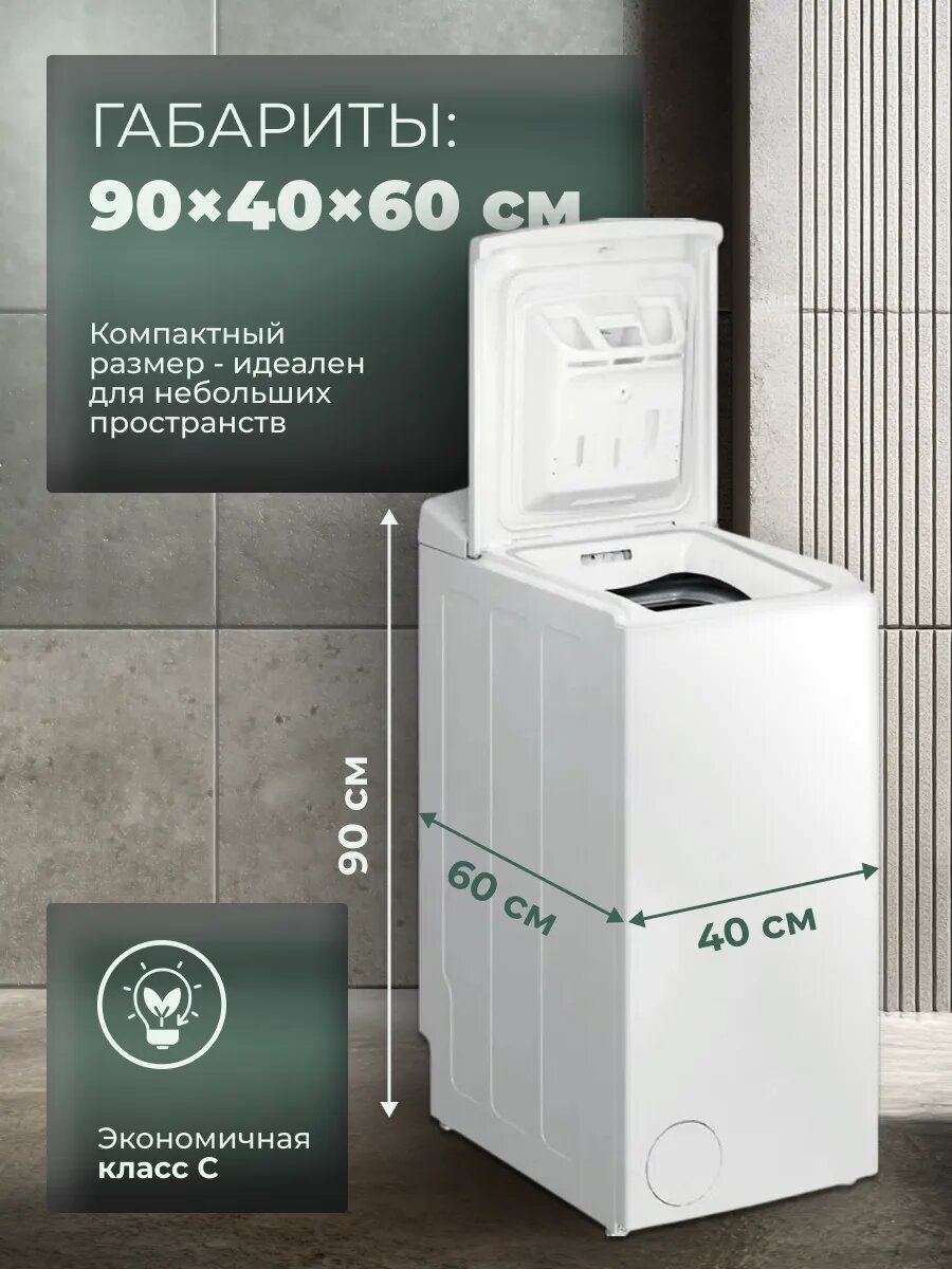 Благодаря вертикальной загрузке, вы сможете существенно сэкономить место в ванной комнате или другом помещении. Больше не нужно наклоняться, чтобы загрузить или вынуть белье – все операции выполняются сверху, что значительно облегчает процесс стирки.