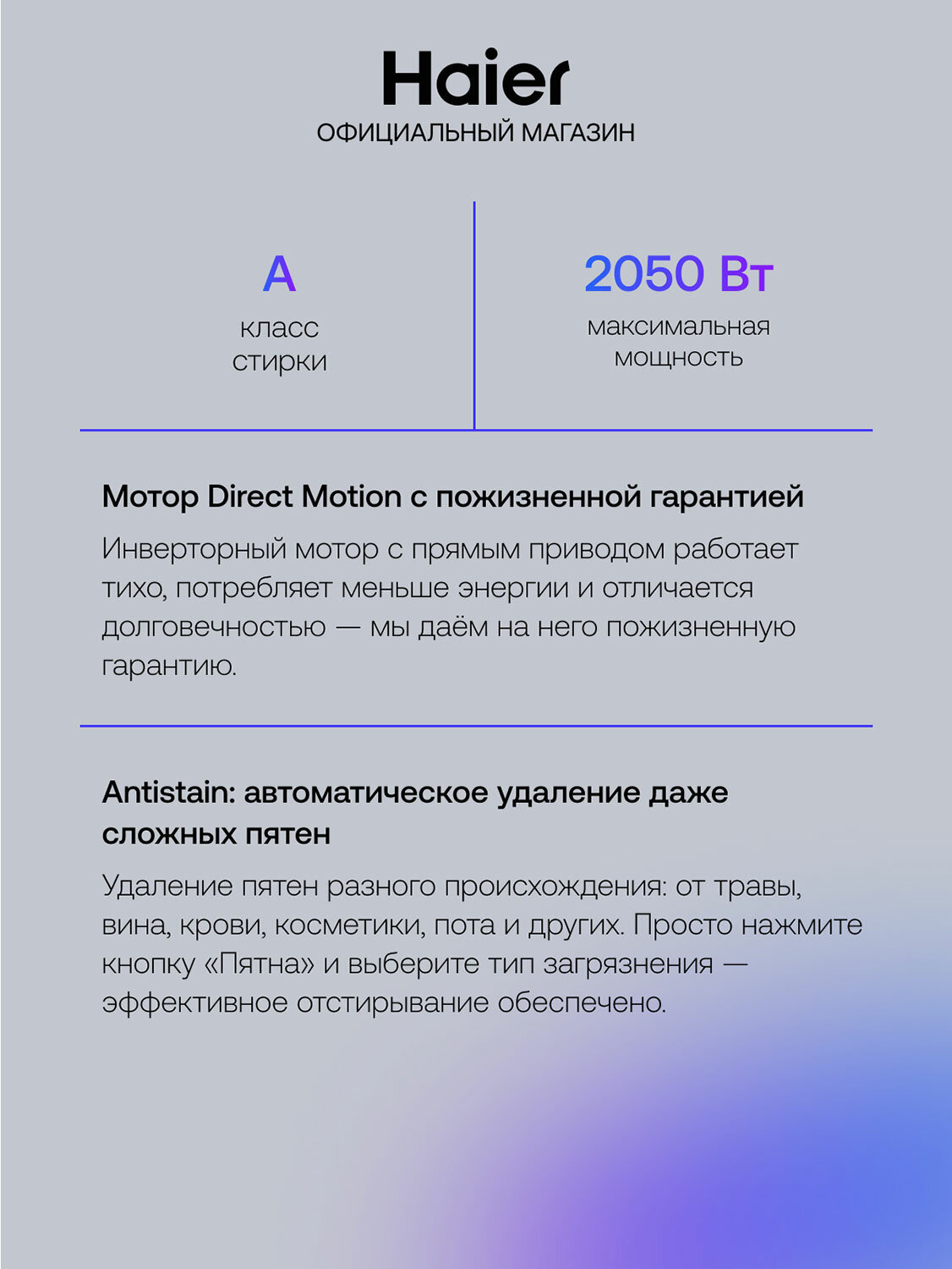 Благодаря инновационным функциям и технологиям, стиральная машина Haier обеспечивает бережную стирку, сохраняя структуру и цвет ваших вещей. Эффективная система сушки позволяет получить сухое и готовое к использованию белье сразу после окончания стирки, избавляя вас от необходимости развешивать его.