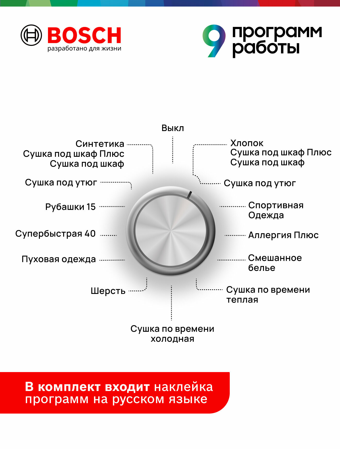 С Bosch WTN86212ME Serie | 4 вы забудете о необходимости развешивать белье и ждать, пока оно высохнет. Благодаря продуманным программам сушки, вы сможете быстро и бережно высушить как деликатные ткани, так и объемные вещи, такие как постельное белье или полотенца. Интеллектуальные сенсоры автоматически определяют уровень влажности и корректируют время сушки, предотвращая пересушивание и сохраняя первозданный вид вашей одежды.