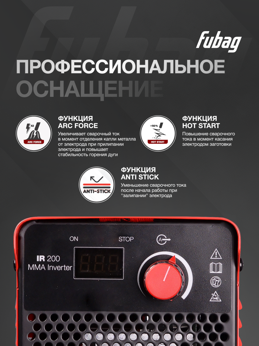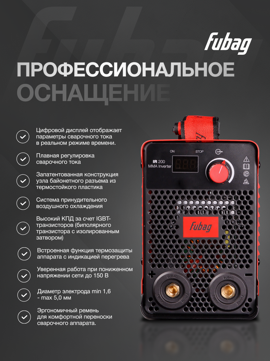 Этот сварочный аппарат станет вашим незаменимым помощником в решении самых разных задач – от ремонта ограждений и изготовления металлоконструкций до кузовного ремонта автомобиля. Fubag IR 200 – это инвестиция в вашу уверенность и профессионализм!