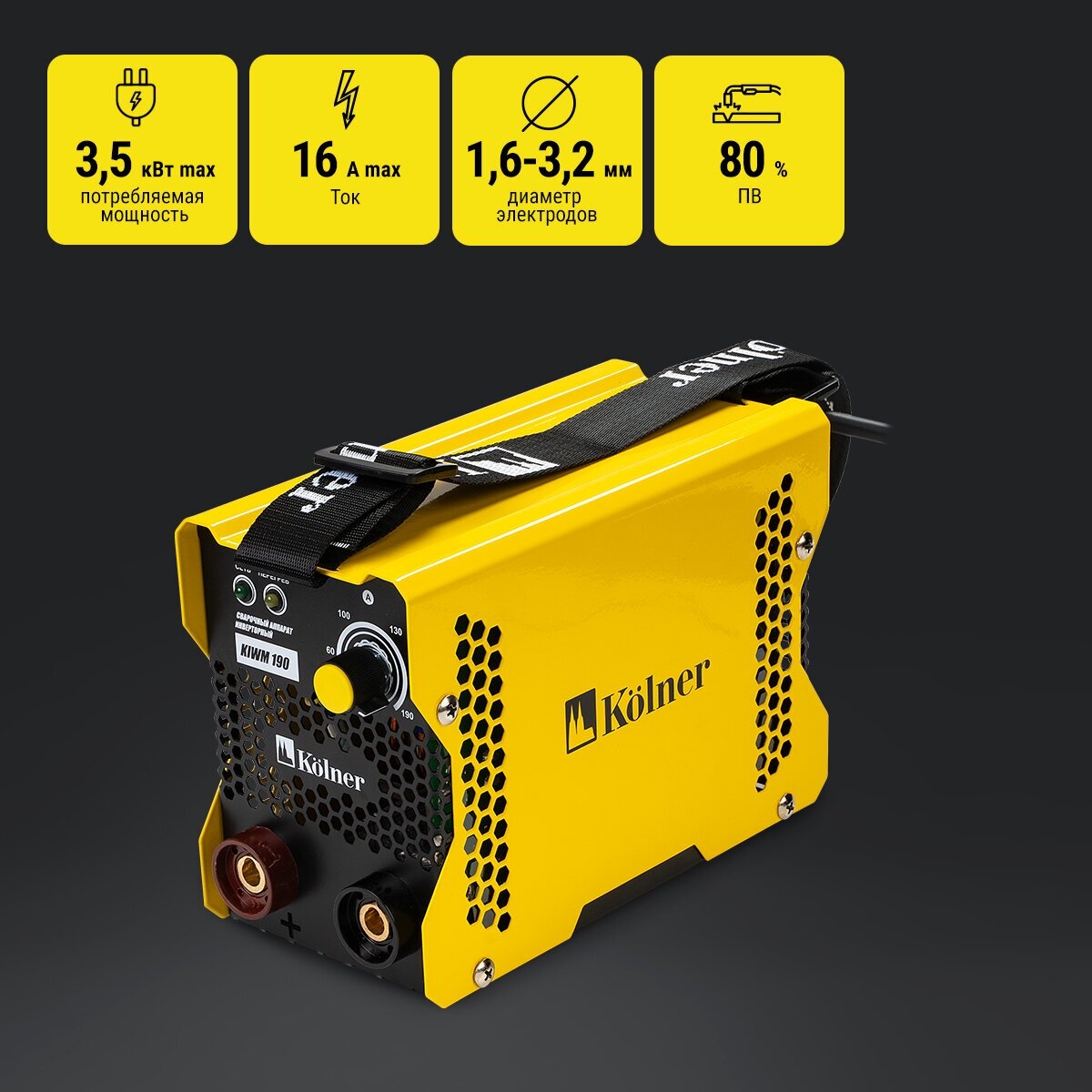Kolner KIWM-190 – это современное решение, использующее инверторную технологию. Благодаря этому аппарат отличается стабильной работой, высоким КПД и небольшим весом, что облегчает его транспортировку и хранение. Вы сможете легко переносить его с места на место, будь то гараж, дача или строительная площадка.