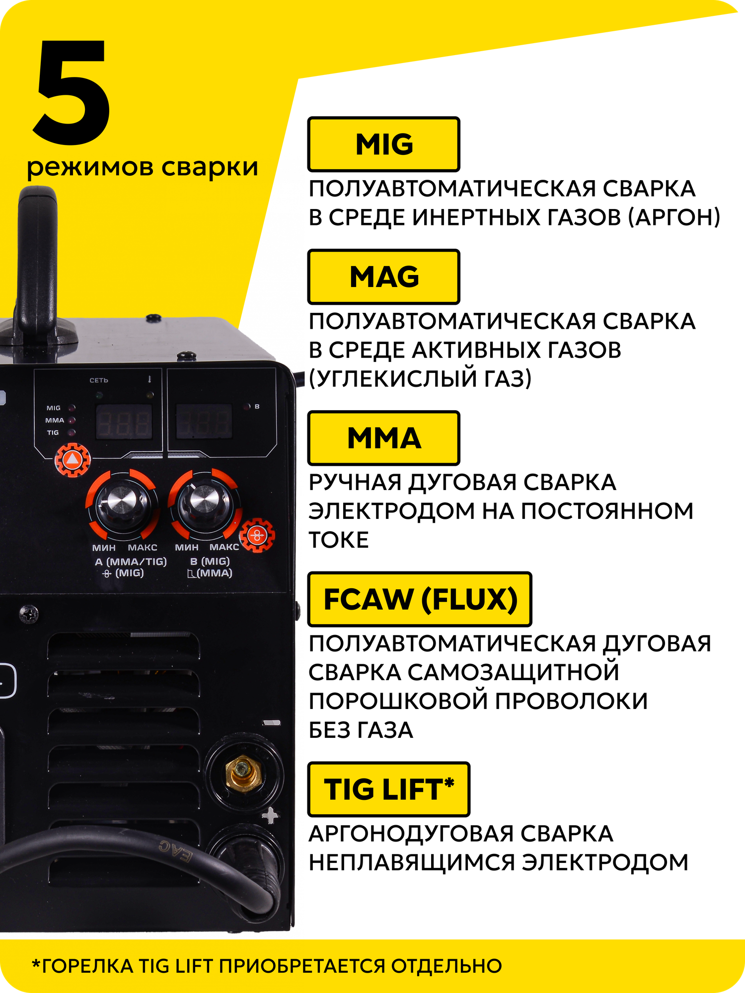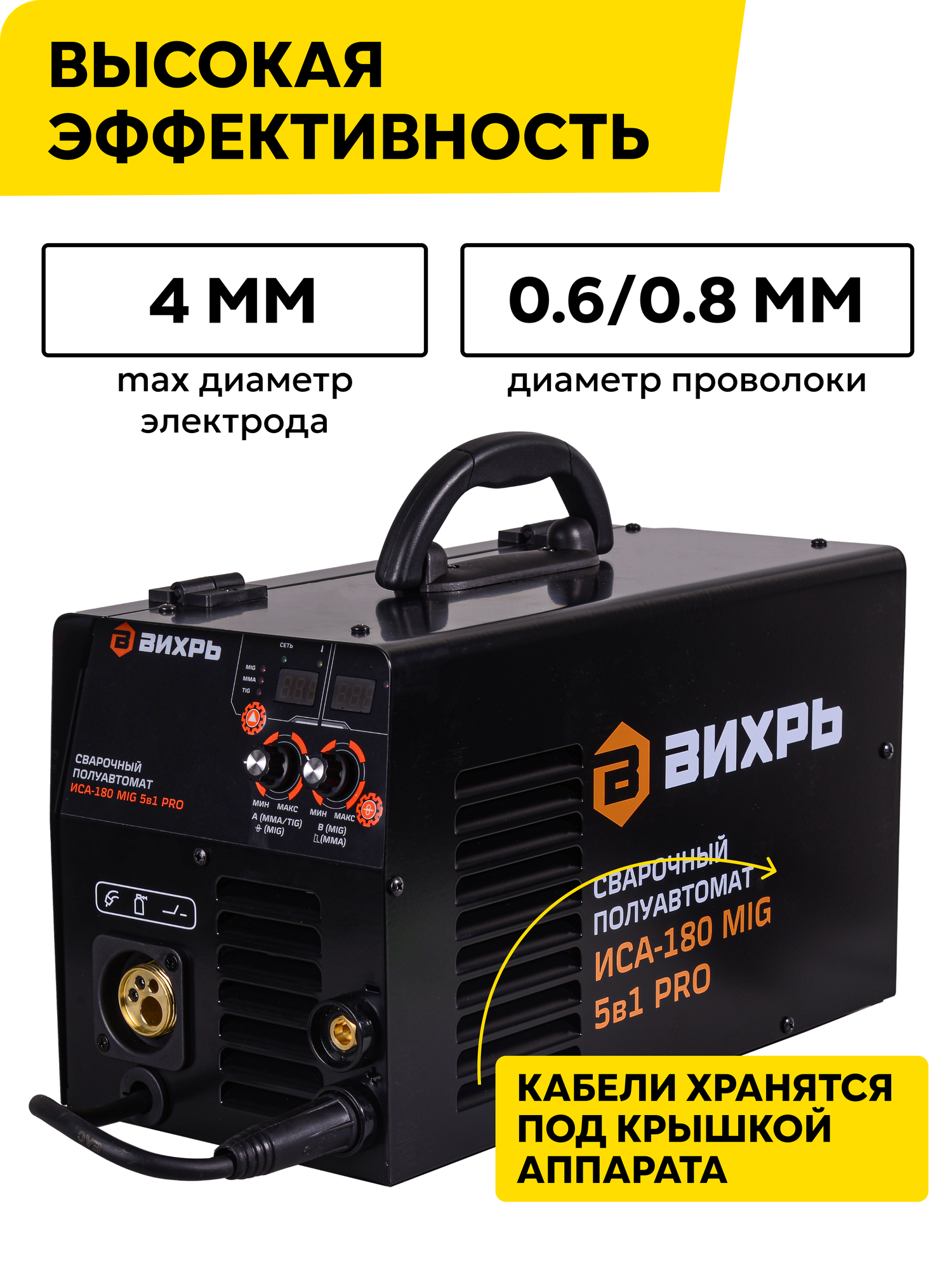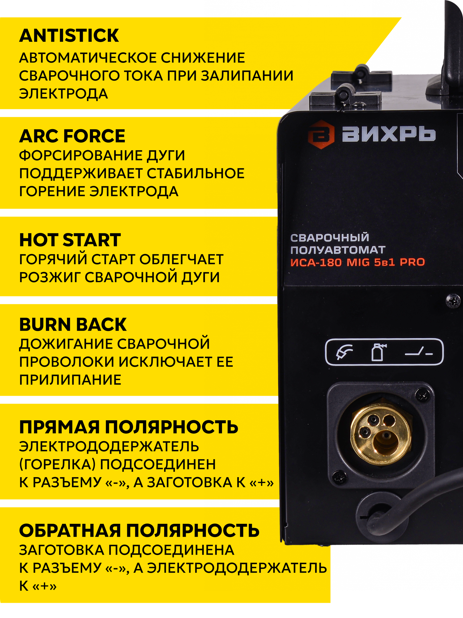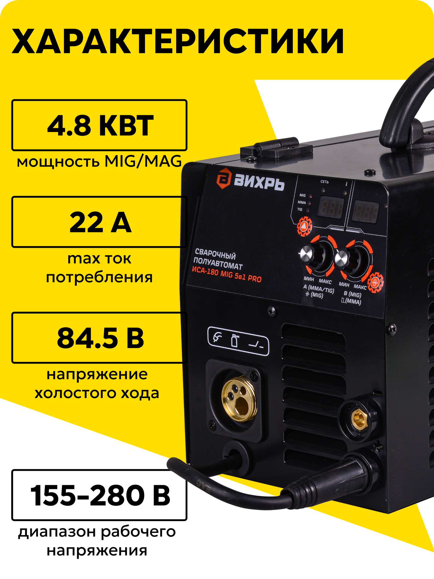 Сварочный полуавтомат ИСА-180 MIG 5в1 PRO Вихрь MIG/MAG, FCAW, SPOT, MМA и TIG, 180А