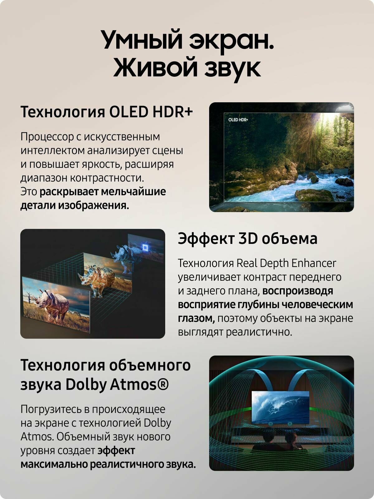 OLED-технология обеспечивает идеальный контраст, где каждый пиксель излучает собственный свет. Это позволяет добиться глубочайшего черного цвета и изумительной детализации в темных сценах. Наслаждайтесь кинематографическим опытом прямо у себя дома, ощущая всю глубину и реалистичность происходящего на экране.