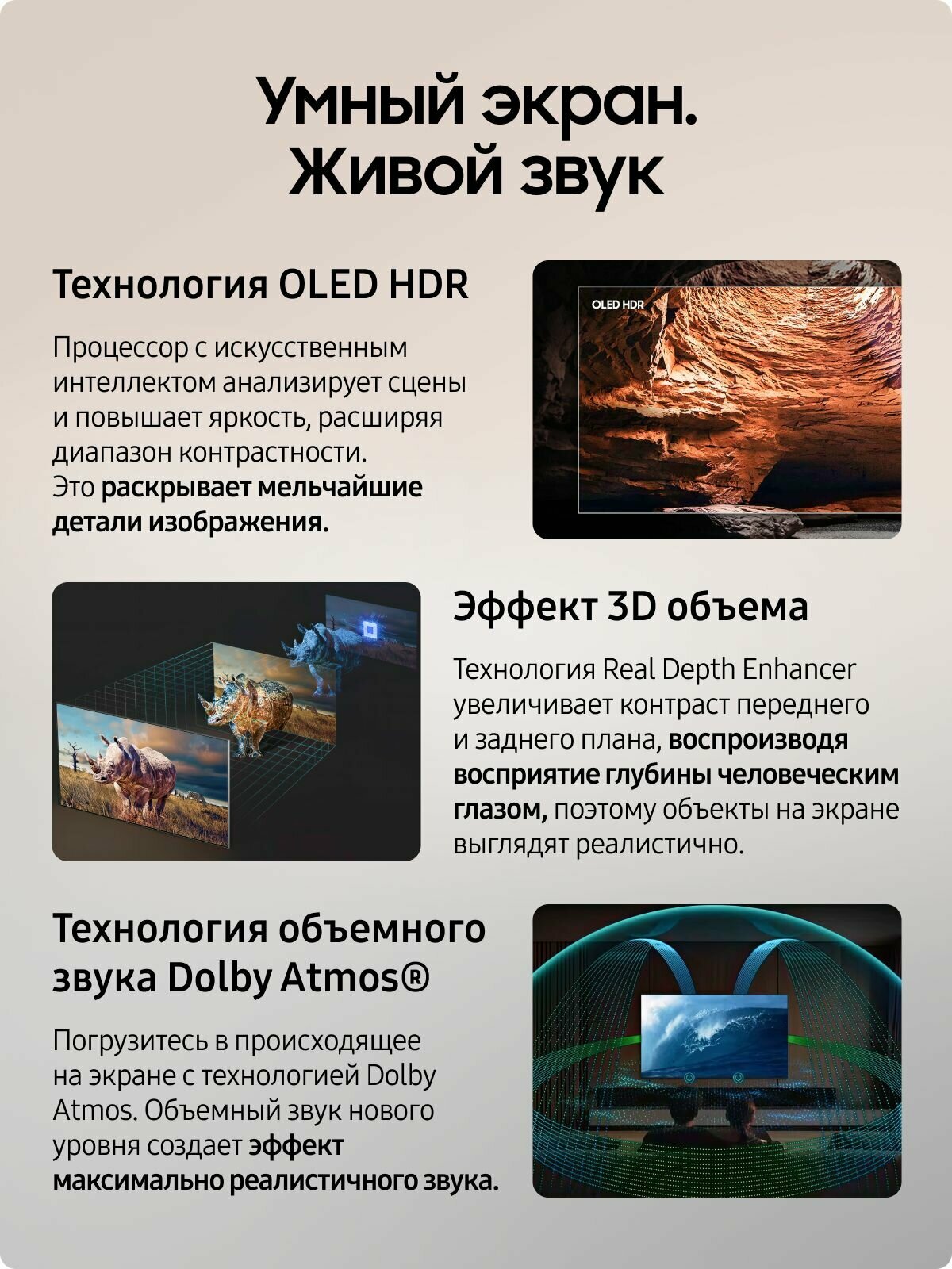 Погрузитесь в мир объемного звука, который окружает вас со всех сторон. Интеллектуальная система обработки звука создает эффект присутствия, делая просмотр еще более захватывающим и реалистичным.