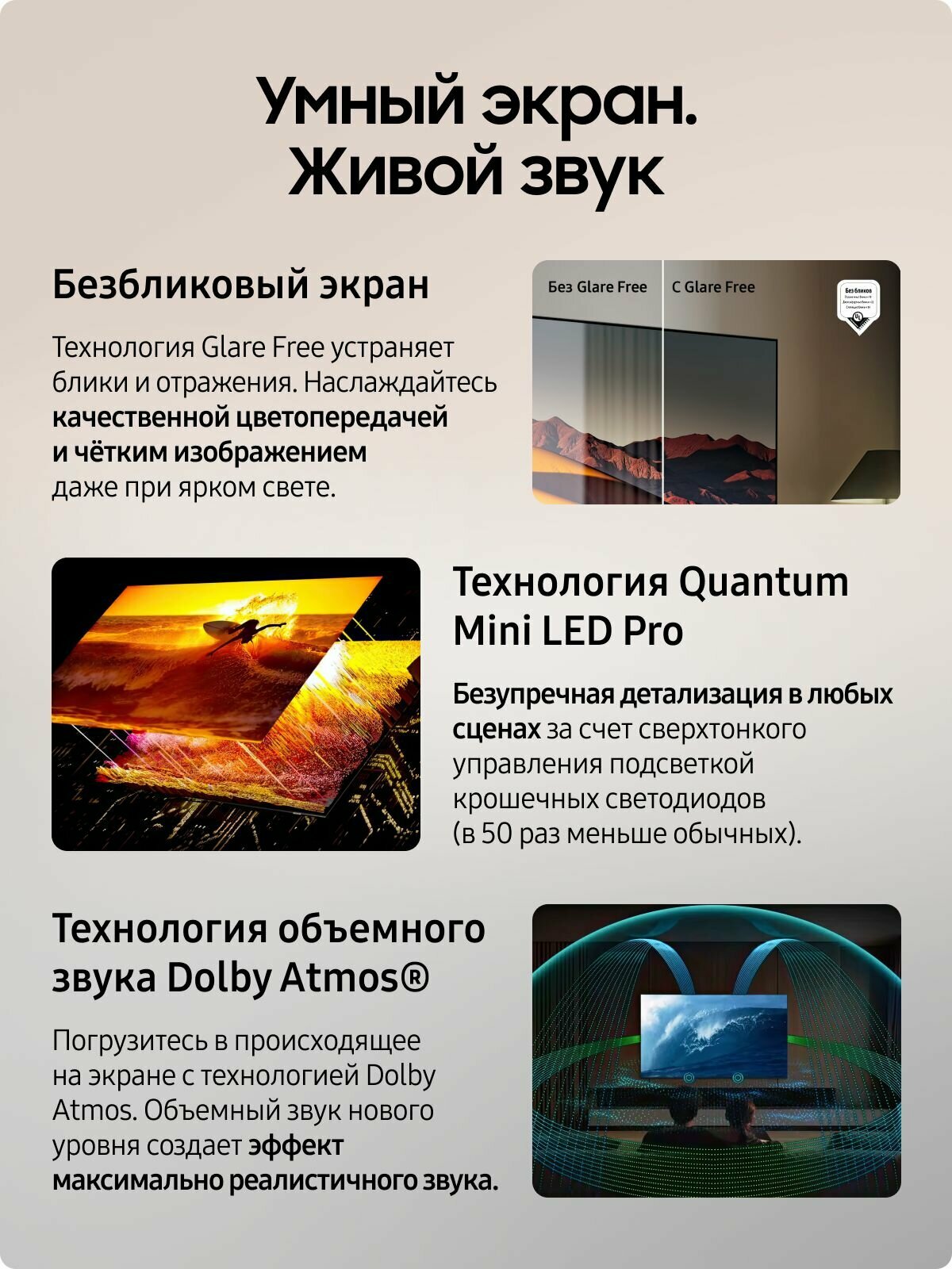 Элегантный и современный дизайн телевизора Samsung QE55QN90FAUXRU (2025) гармонично впишется в любой интерьер. Тонкие рамки и изящные линии подчеркнут его премиальный статус и добавят изысканности вашей гостиной.