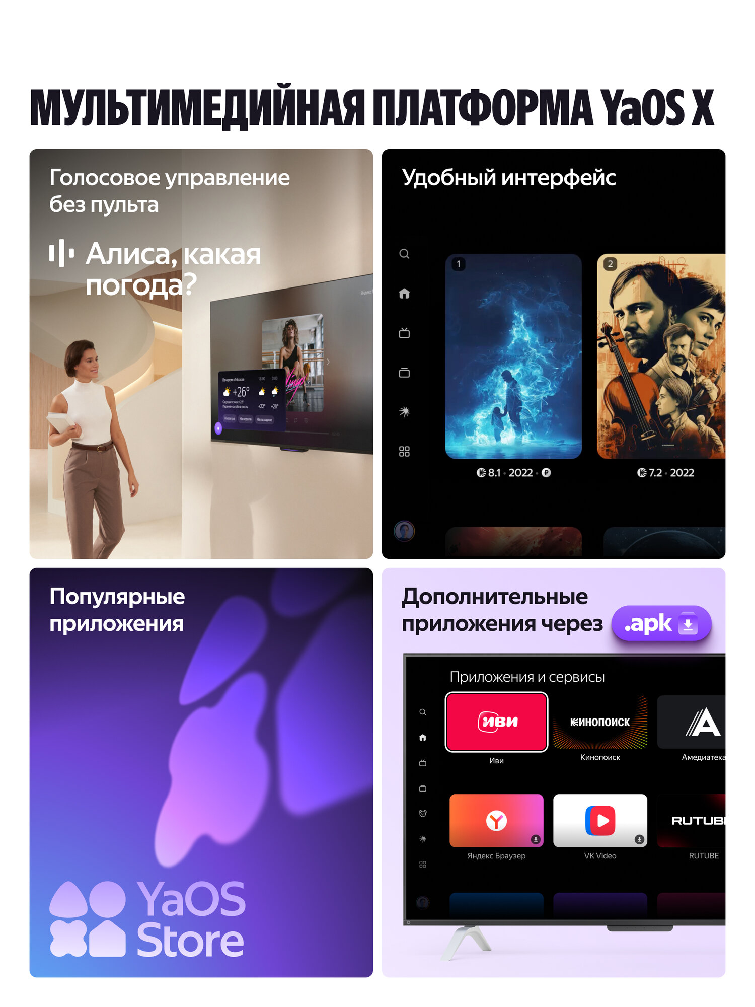 С Яндекс ТВ Станцией Про у вас будет доступ к огромной библиотеке фильмов, сериалов, музыки и игр. Смотрите любимые онлайн-кинотеатры, слушайте музыку и играйте в игры, не выходя из дома. Интуитивно понятный интерфейс и удобная навигация сделают использование телевизора максимально простым и приятным.