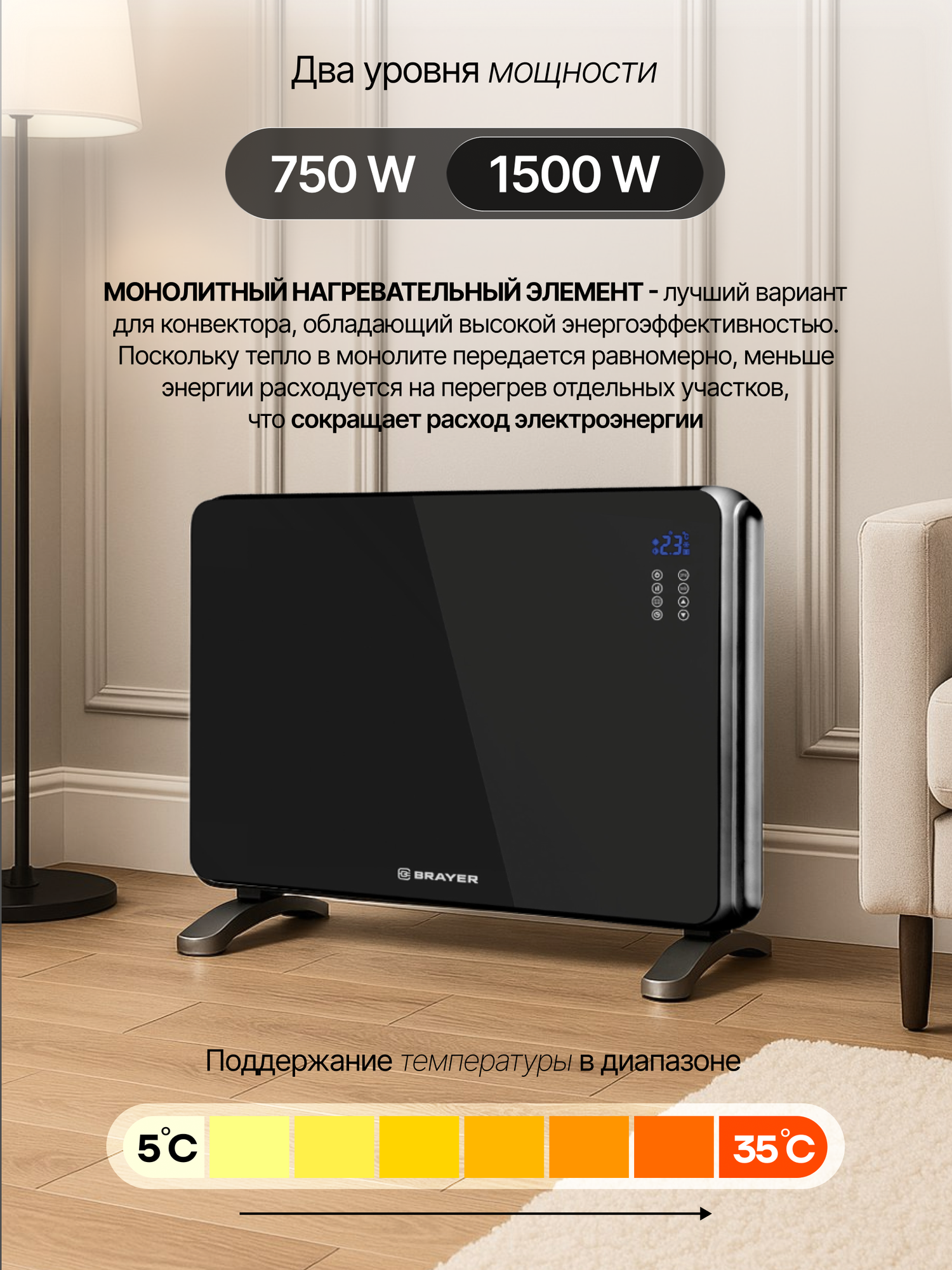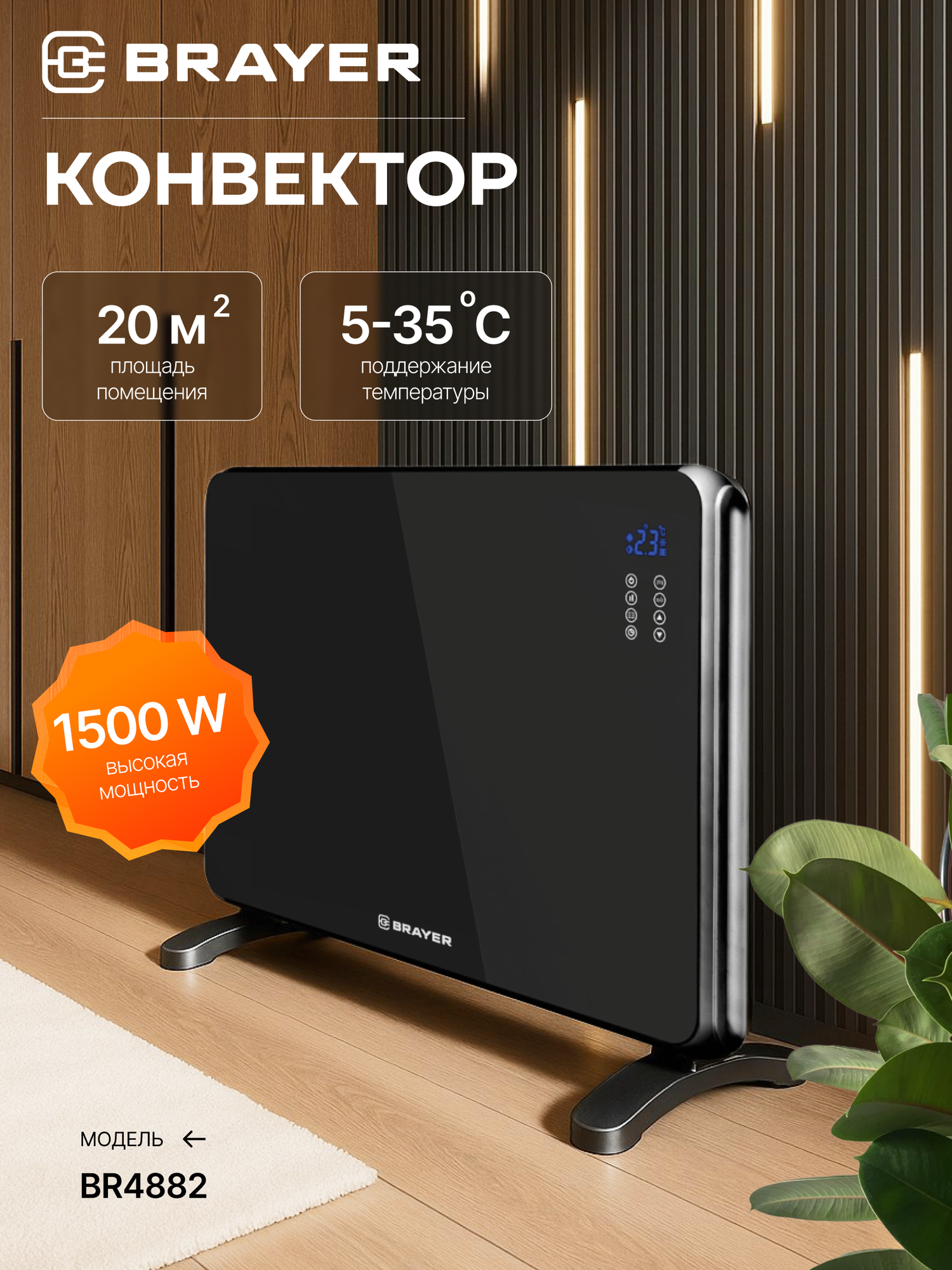 Конвекторный тип нагрева обеспечивает равномерное распределение тепла по всему помещению, избавляя от холодных зон и сквозняков. Забудьте о необходимости долго ждать, пока комната прогреется – с Brayer BR4882 вы почувствуете тепло практически мгновенно.