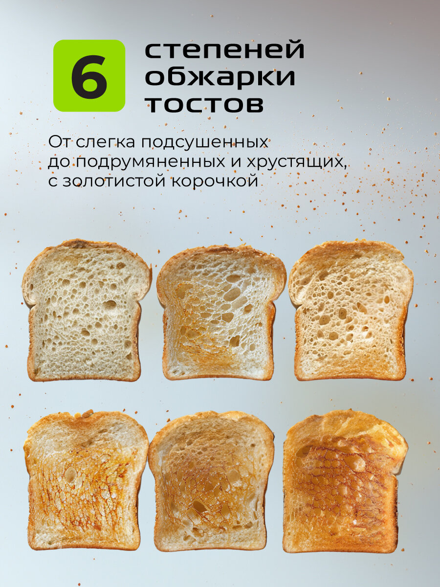 С тостером Red Solution M460D вы сможете легко приготовить тосты на любой вкус. Благодаря наличию нескольких режимов поджаривания, вы сможете выбрать оптимальную степень обжарки, от легкой золотистой корочки до насыщенного коричневого цвета. Больше не нужно беспокоиться о том, что тост подгорит или останется сырым – просто выберите нужный режим и наслаждайтесь идеальным результатом.