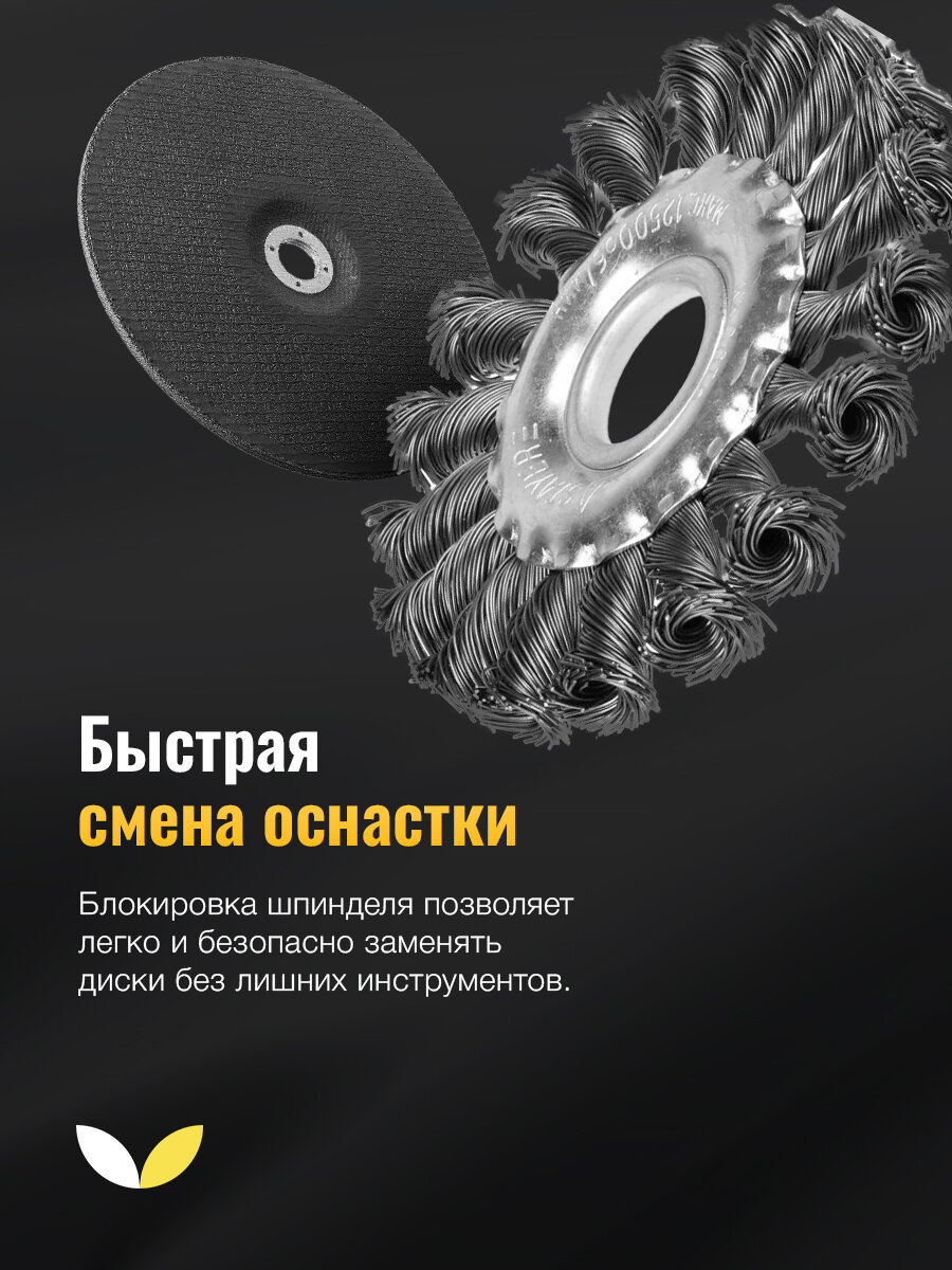 Продуманная система защиты от пыли и перегрузок значительно увеличивает срок службы инструмента, а также обеспечивает безопасность оператора. Удобная блокировка шпинделя позволяет быстро и легко менять диски, экономя ваше время и силы.