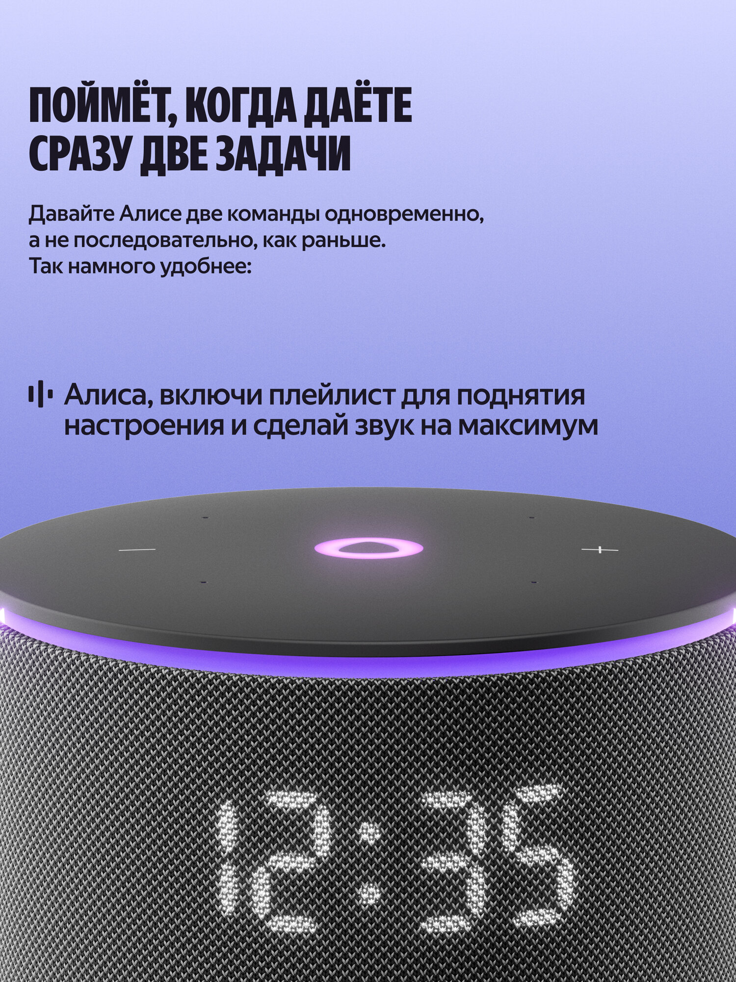 Алиса всегда готова помочь. Встроенный голосовой помощник Алиса станет вашим надежным ассистентом в решении повседневных задач. Просто скажите: "Алиса, включи свет в гостиной", "Алиса, поставь будильник на 7 утра" или "Алиса, расскажи последние новости", и она мгновенно выполнит вашу просьбу.