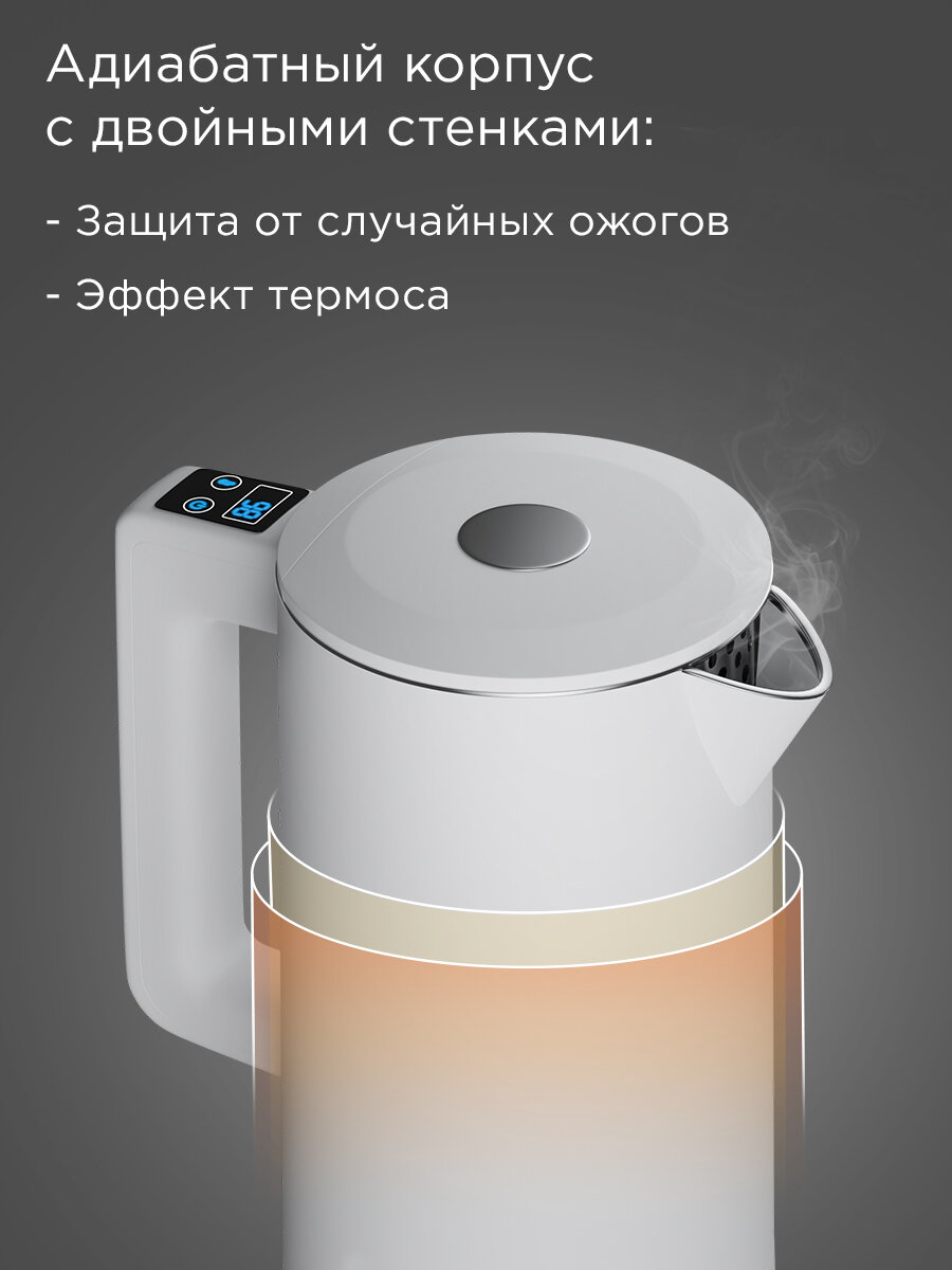 Двойные стенки чайника обеспечивают превосходную теплоизоляцию. Вода вскипятится быстро и останется горячей значительно дольше, экономя ваше время и электроэнергию. Внешняя поверхность корпуса при этом не нагревается, что делает использование чайника безопасным для всей семьи, особенно если в доме есть дети.