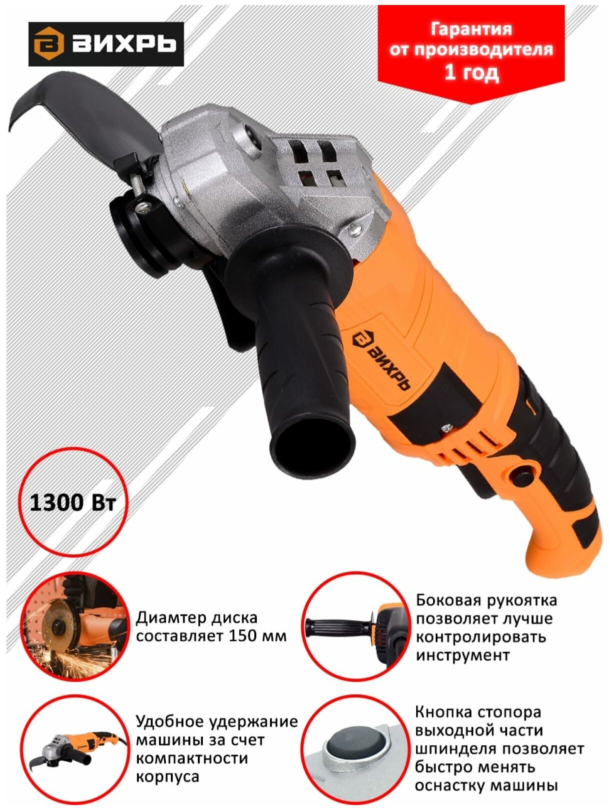 Угловая шлифовальная машина (УШМ) ВИХРЬ 72124 – это надежный и мощный инструмент, предназначенный для выполнения широкого спектра задач по резке, шлифовке и зачистке различных материалов. Этот инструмент станет незаменимым помощником как для профессионалов, так и для домашних мастеров, позволяя быстро и эффективно справляться с самыми разнообразными работами.