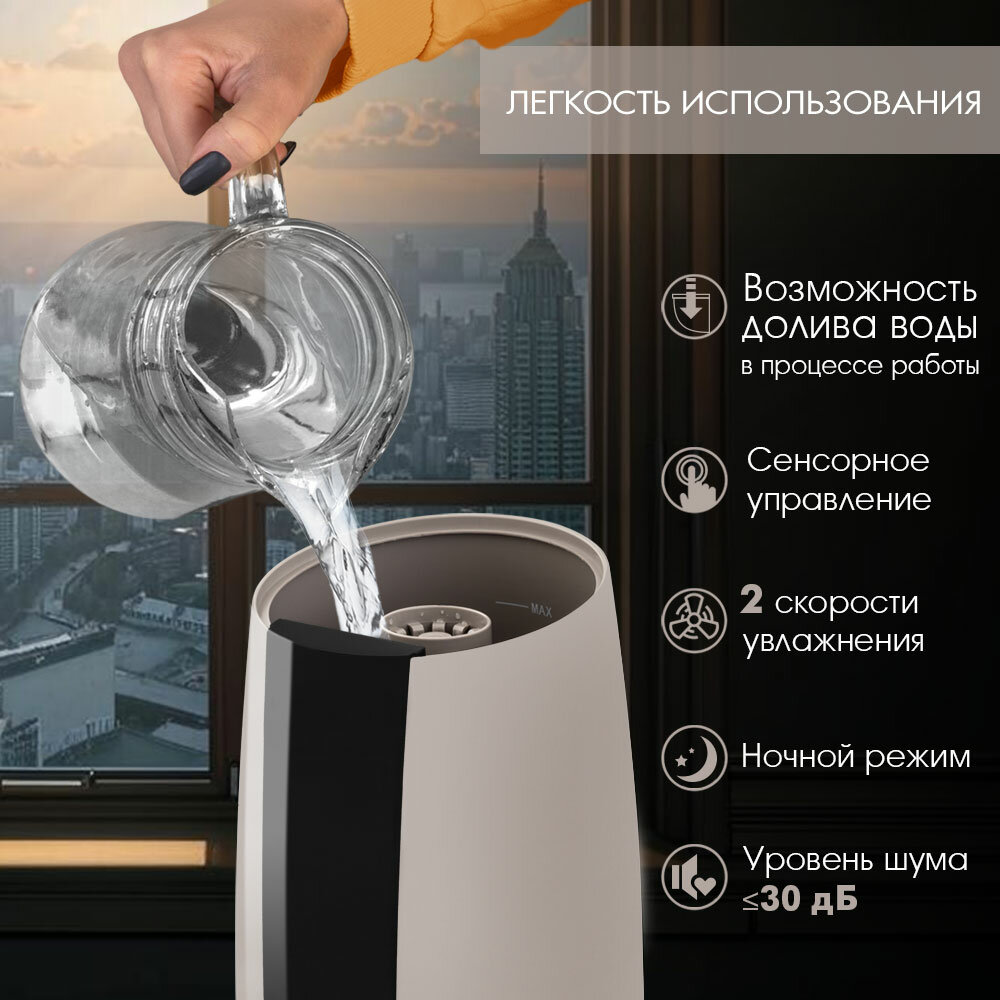 Этот увлажнитель не только улучшает микроклимат в помещении, но и создает уютную обстановку благодаря своему элегантному дизайну. Он прекрасно впишется в любой интерьер и станет его ненавязчивым, но полезным дополнением.