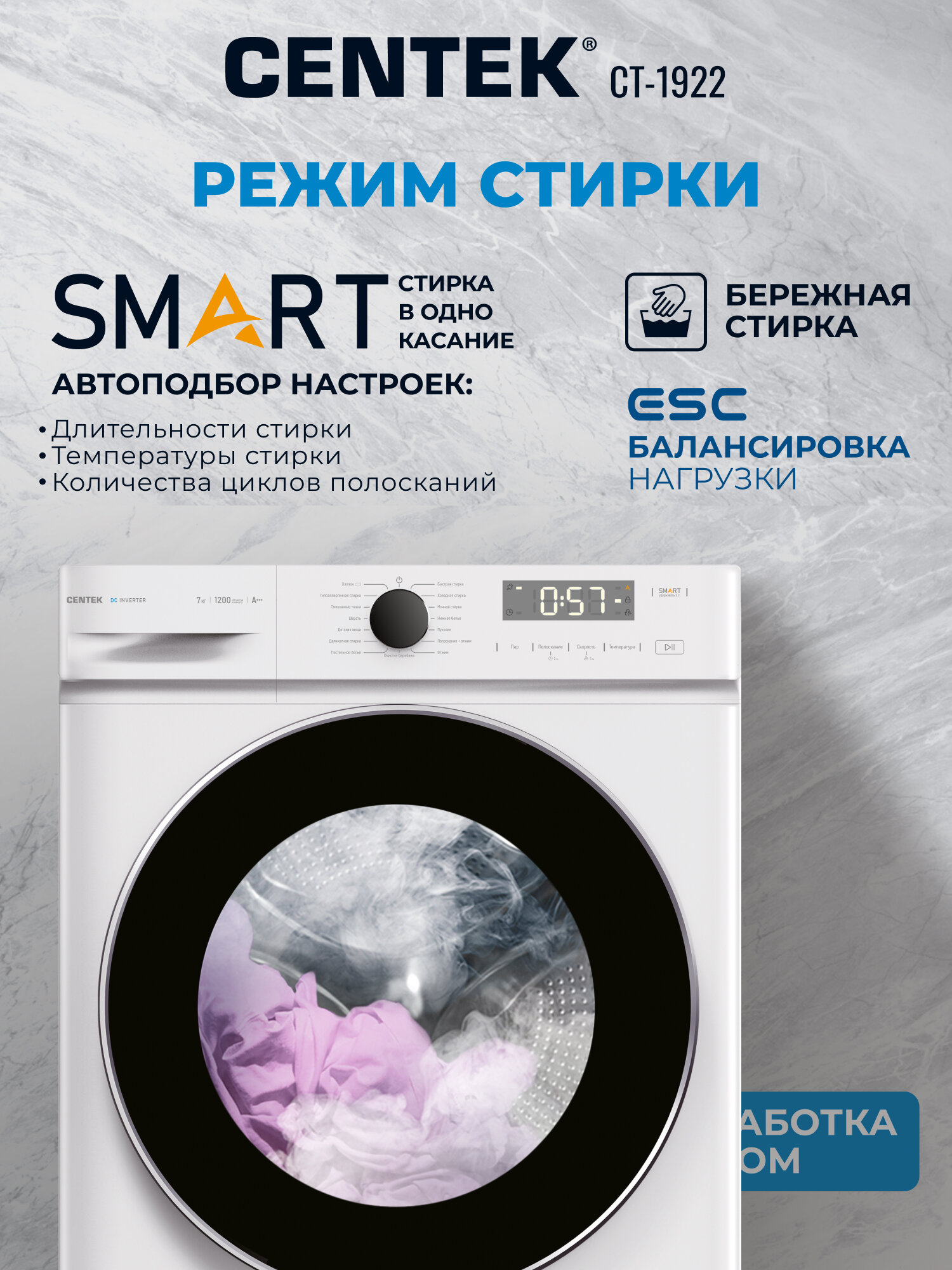 Благодаря разнообразию программ стирки, вы сможете легко справиться с любыми задачами: от деликатной стирки шелка и шерсти до интенсивной стирки сильно загрязненного белья. С Centek CT-1922 ваша одежда всегда будет выглядеть безупречно.