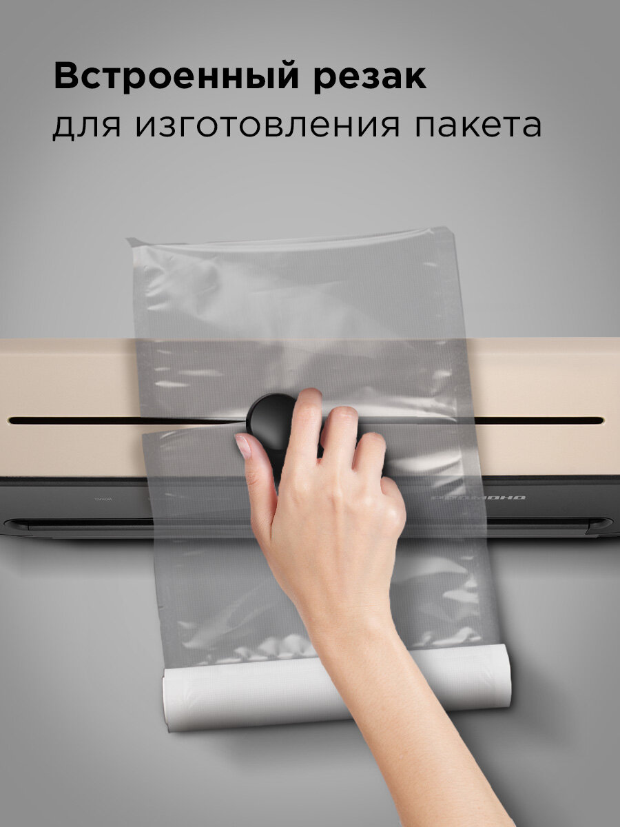Redmond VS1502 оснащен удобным встроенным резаком, который позволяет легко и быстро отрезать пакет необходимой длины из рулона, входящего в комплект. Больше не нужно искать ножницы – все под рукой! В комплекте также имеются пакеты для вакуумной упаковки, что позволяет начать использование прибора сразу после покупки.