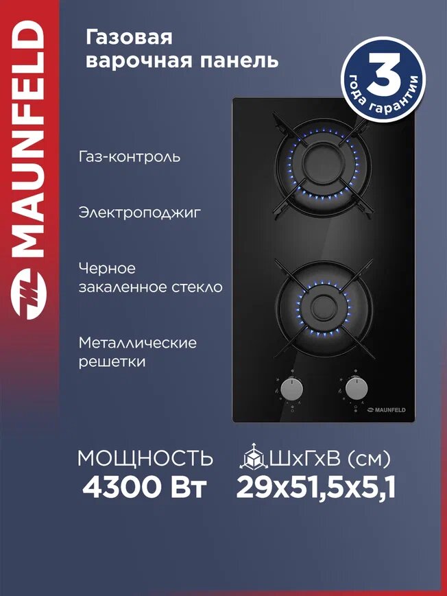 Газовая варочная панель Maunfeld EGHG321EBG – это оптимальное сочетание стиля, функциональности и практичности. Она станет незаменимым помощником на вашей кухне, позволяя готовить любимые блюда с удовольствием и комфортом. Забудьте о громоздких плитах – выбирайте компактное и эффективное решение от Maunfeld!