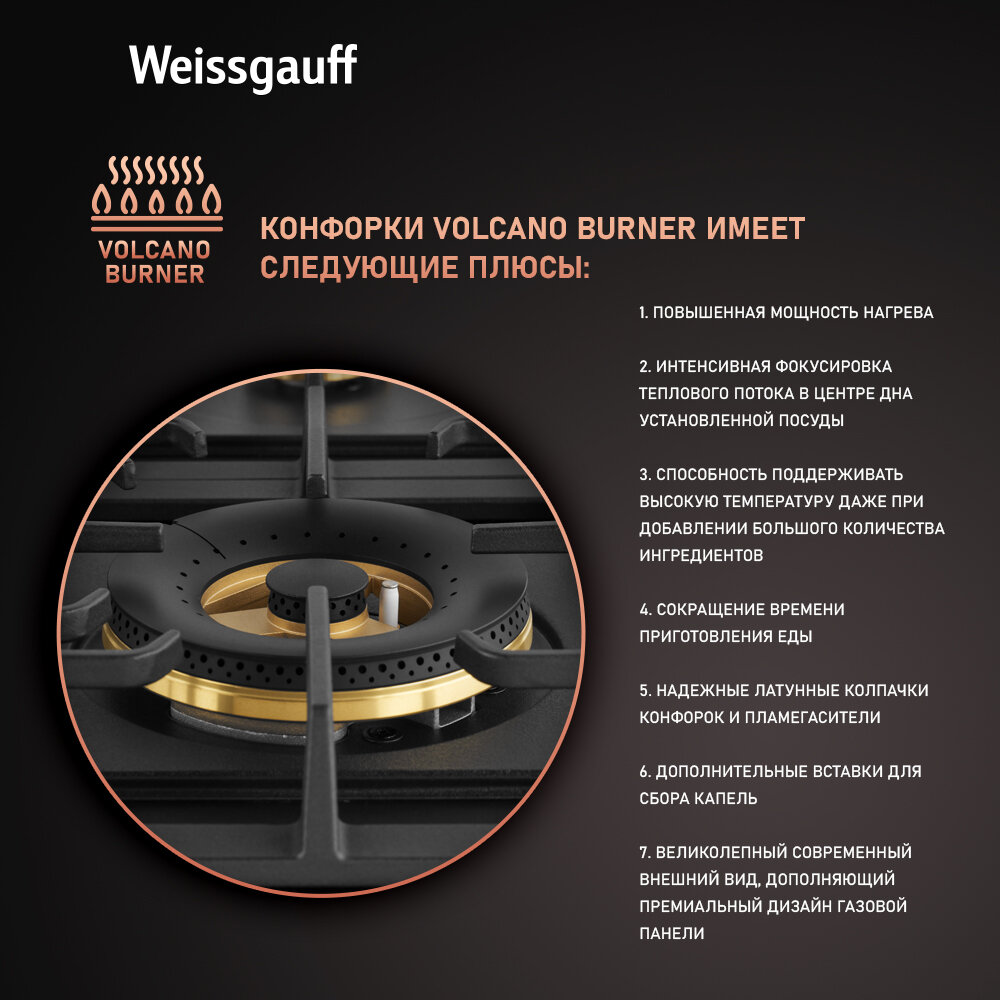С варочной панелью Weissgauff HGG 641 BV Volcano Burner вы сможете воплотить в жизнь любые кулинарные фантазии, наслаждаясь процессом приготовления и радуя близких вкусными и полезными блюдами. Это не просто варочная панель – это инвестиция в комфорт и качество вашей жизни.