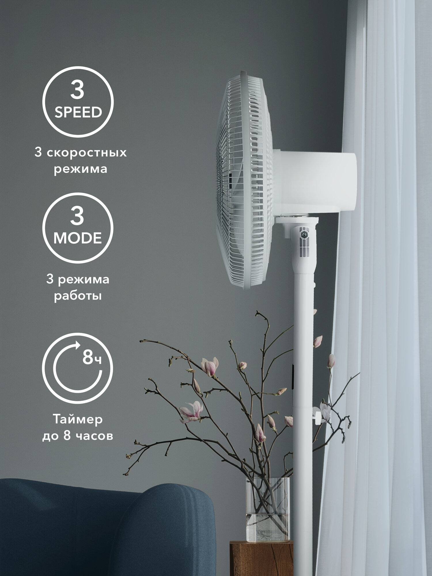 Этот вентилятор напольного типа легко перемещается из комнаты в комнату, обеспечивая прохладу там, где она больше всего необходима. Благодаря регулируемой высоте и углу наклона, вы можете настроить направление воздушного потока в соответствии с вашими потребностями.