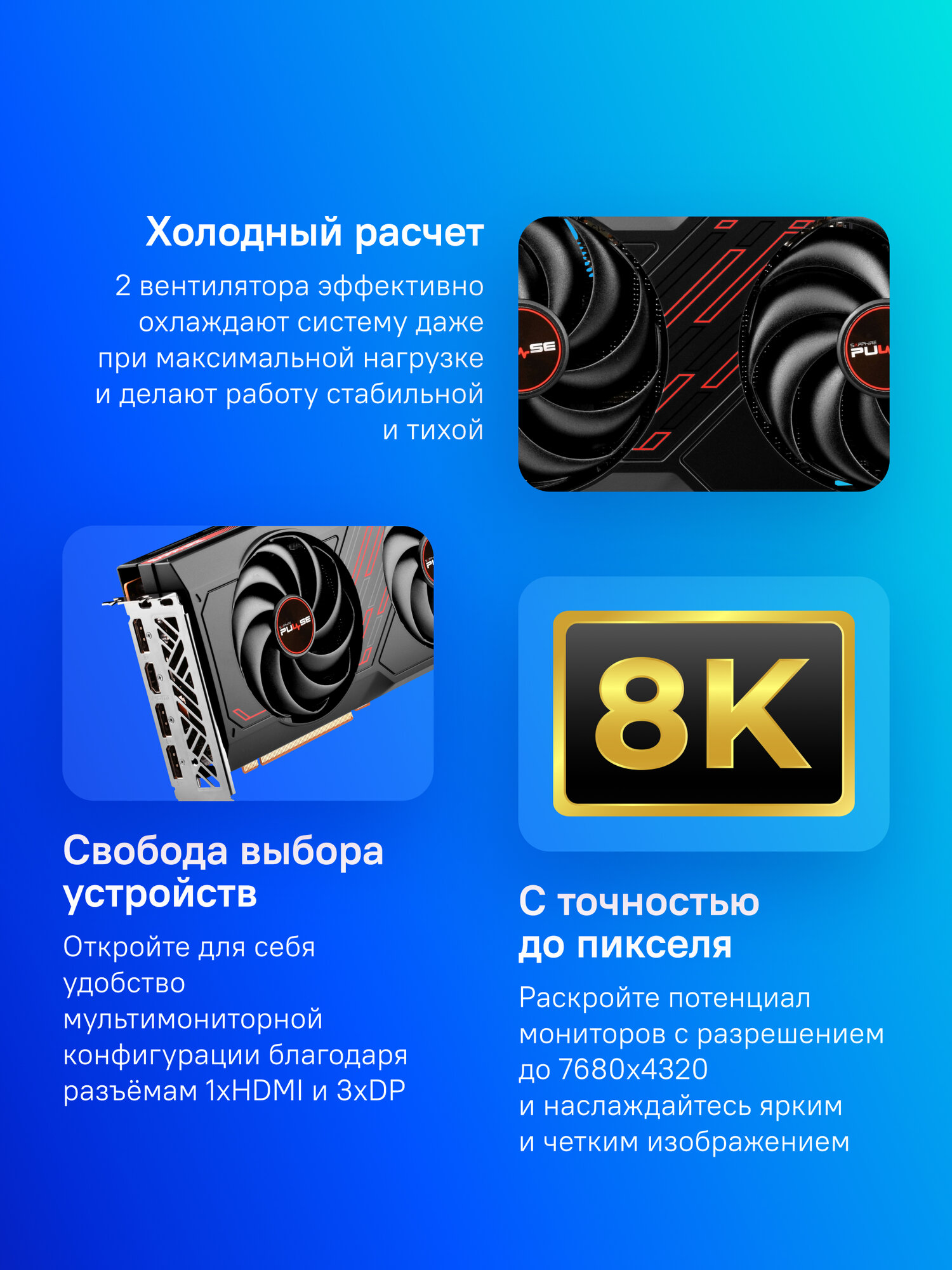 Система охлаждения Sapphire Pulse RX 7600 Gaming разработана для поддержания оптимальной температуры даже при высоких нагрузках. Эффективные вентиляторы и радиаторы отводят тепло, обеспечивая стабильную работу видеокарты и предотвращая перегрев. Это позволяет вам играть в любимые игры часами, не беспокоясь о производительности.