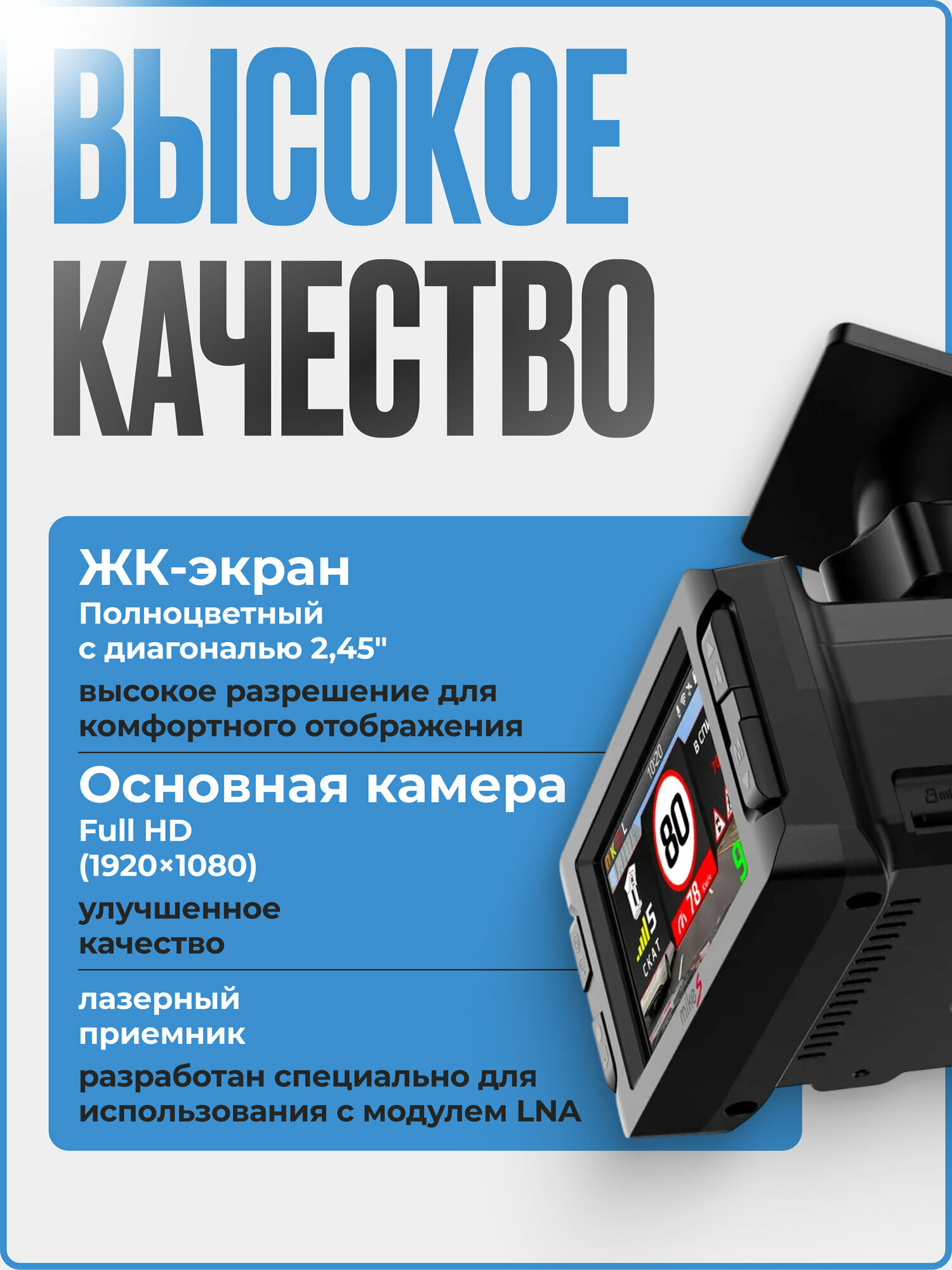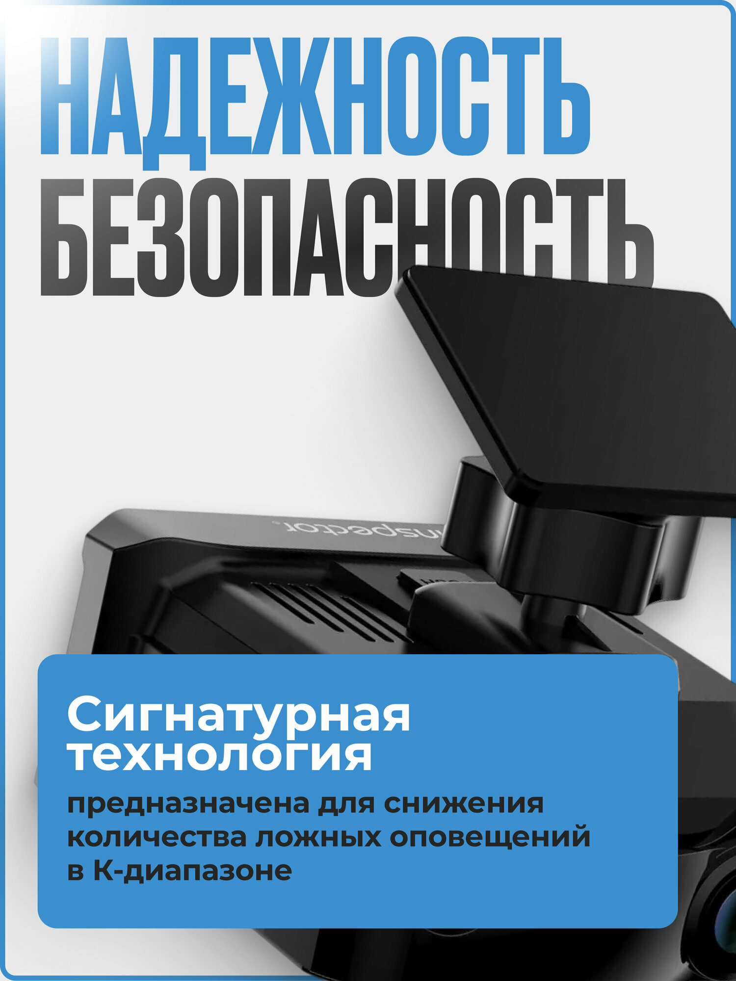 Самое компактное комбо-устройство с LNA-усилителем, с креплением c активным питанием, возможностью обновления через Wi-Fi, сигнатурной технологией распознавания радаров, классическим рупором, встроенным модулем GPS/GLONASS и улучшенным качеством съемки Full HD INSPECTOR Mike S pro – это сигнатурное комбо-устройство нового поколения, включающее в себя большое количество инноваций: • Модуль LNA (Low Noise Amplifier) - это усилитель сигналов радарных комплексов К-диапазона и лазерных измерителей скорости. Результатом его применения является увеличенная дистанция приема сигналов радаров, включая установленных "в спину". А также уверенный прием сигналов новых маломощных радарных комплексов, распространяющихся как на территории РФ, так и странах ближайшего зарубежья (Узбекистан, Казахстан, и др.); • Рупорная антенна нового поколения - разработана специально для использования с модулем LNA для повышения чувствительности детектирования; • Усовершенствованный лазерный приемник - разработан специально для использования с модулем LNA, обладает увеличенной дистанцией детектирования, что играет ключевую роль при приеме сигналов лазерных измерителей скорости; • Сигнатурная технология предназначена для снижения количества ложных оповещений в К-диапазоне с помощью распознавания сигналов радаров и сопоставления их с заложенной в память устройства обновляемой библиотекой сигнатур; • Полноцветный ЖК-экран с диагональю 2,45" высокого разрешения для комфортного отображения обширной информации из базы радаров и камер, включающей в себя ограничение скорости, тип радара камеры, расстояние до места установки и объекты контроля. Поворотное на 360◦ градусов крепление с активным питанием, кабель питания подключается к креплению без необходимости его отключения; • Встроенный Wi-Fi модуль позволяет установить связь со смартфоном на базе Android или с iPhone, чтобы с помощью официального приложения иметь возможность обновить программное обеспечение или базу радаров и камер, не выходя из автомобиля. Помимо этого, приложение позволяет просмотреть видеозаписи или внести изменения в настройки устройства.
