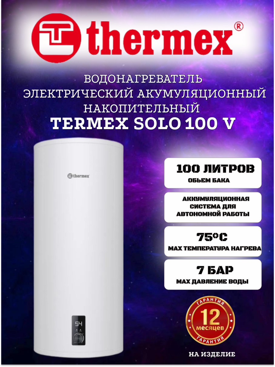 Выбирая Thermex Solo 100 V, вы выбираете надежность, эффективность и комфорт. Обеспечьте свою семью горячей водой в любое время с этим отличным водонагревателем!