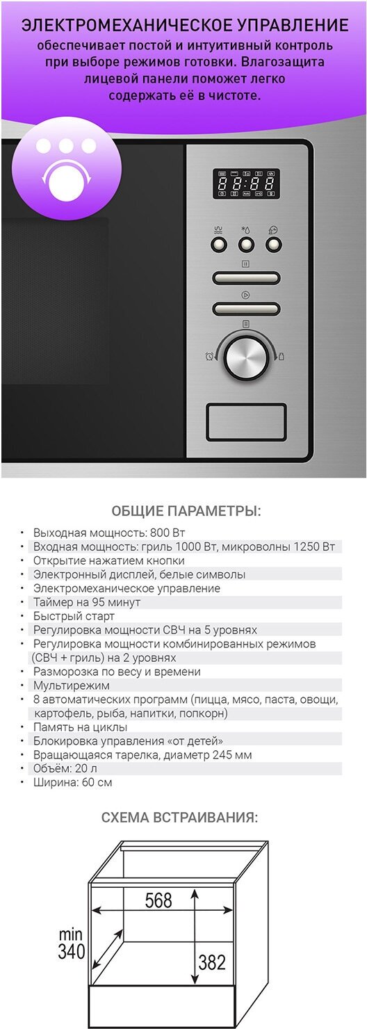 Благодаря своему лаконичному дизайну и элегантному исполнению, Zigmund & Shtain BMO 16202 S подчеркнет вашу индивидуальность и придаст кухне завершенный вид. Простота в управлении позволит вам легко и быстро разогревать, размораживать и готовить любимые блюда.
