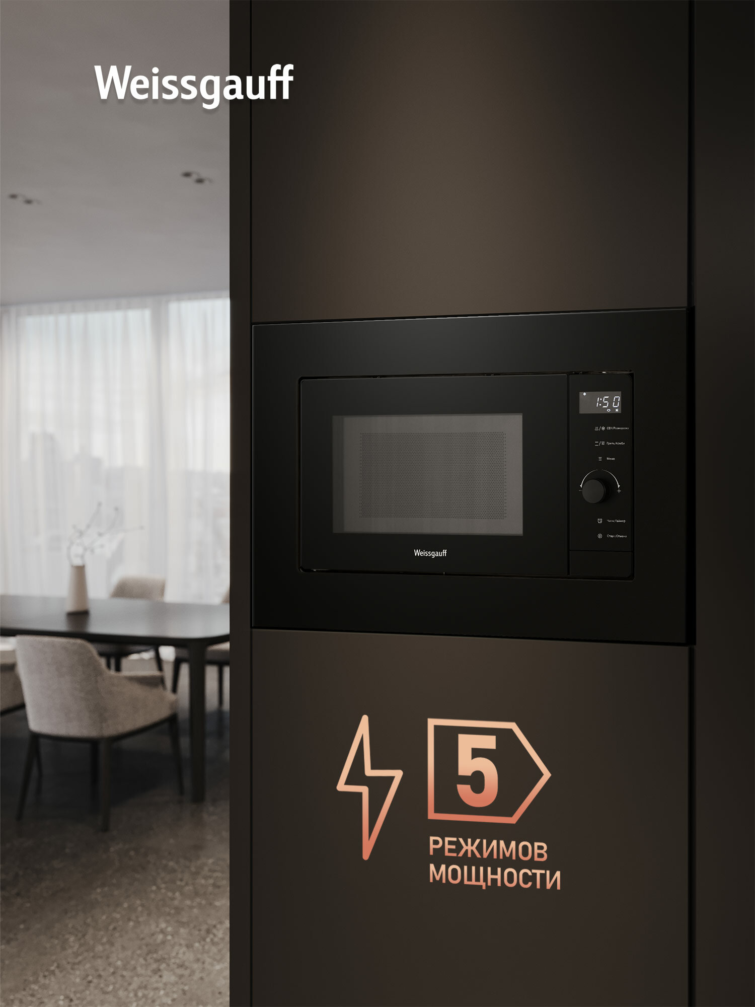 Встраиваемая конструкция микроволновой печи позволит оптимально использовать пространство на вашей кухне, гармонично вписав прибор в любой интерьер. Матовое покрытие корпуса не только выглядит стильно и современно, но и практично в использовании, не оставляя отпечатков пальцев и легко очищаясь от загрязнений.