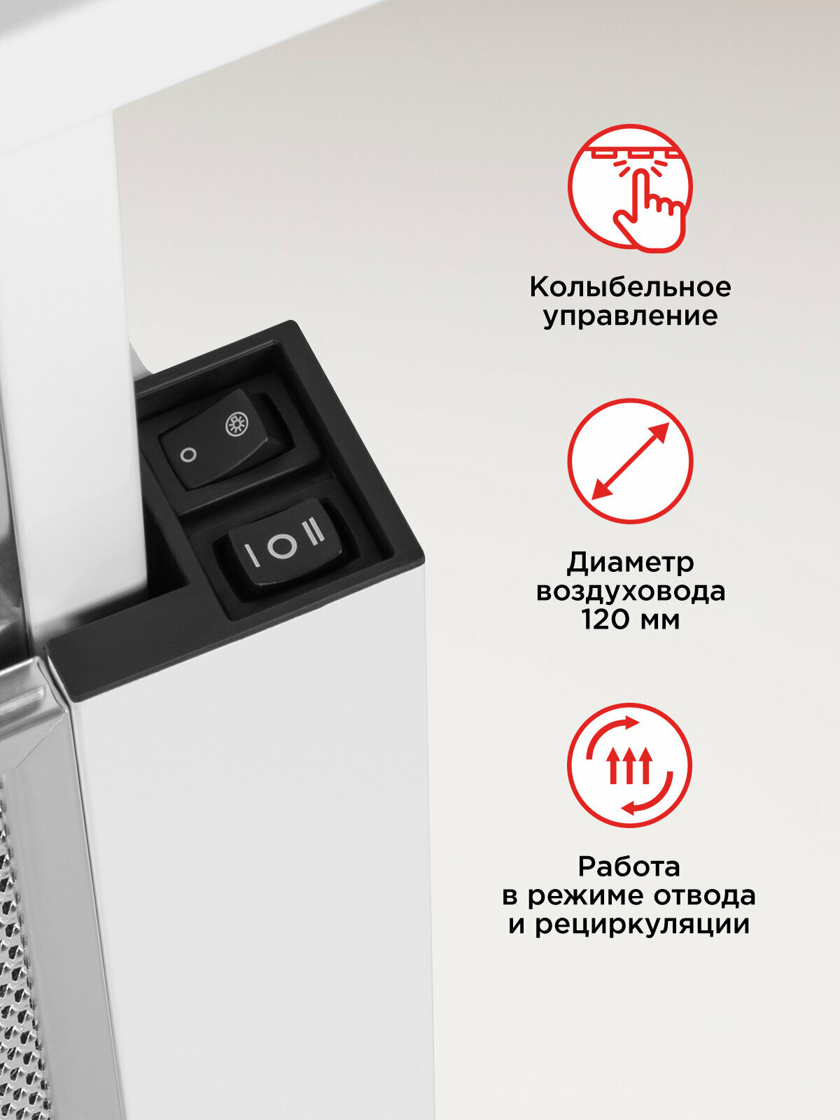 Вытяжка оснащена двумя скоростями работы, что позволяет вам выбрать оптимальный режим в зависимости от интенсивности приготовления пищи. Простое и интуитивно понятное управление обеспечивает комфортное использование вытяжки в повседневной жизни. Она эффективно удаляет запахи, дым и испарения, создавая чистую и свежую атмосферу на вашей кухне.
