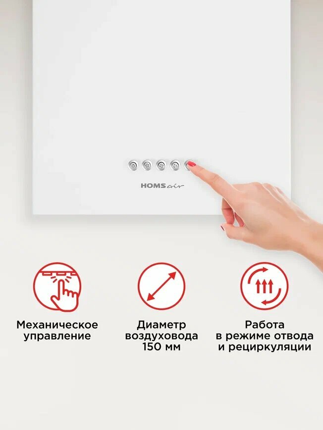 Homsair Phlox Push 40 оснащена интуитивно понятным управлением, что делает ее эксплуатацию максимально простой и комфортной. Вы сможете легко выбрать оптимальный режим работы, чтобы быстро и эффективно удалить запахи, пар и дым, возникающие во время приготовления пищи.