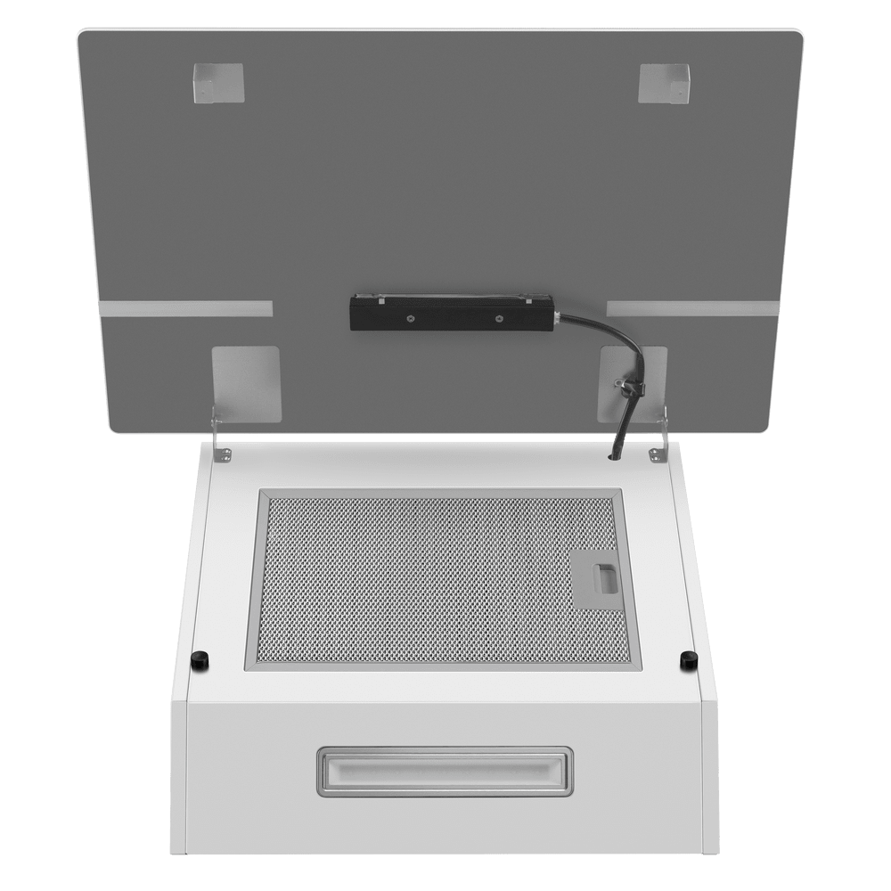 Светодиодное освещение обеспечивает яркую и экономичную подсветку рабочей поверхности, что позволяет комфортно готовить даже в темное время суток. Белый цвет корпуса придает вытяжке элегантный и современный вид.