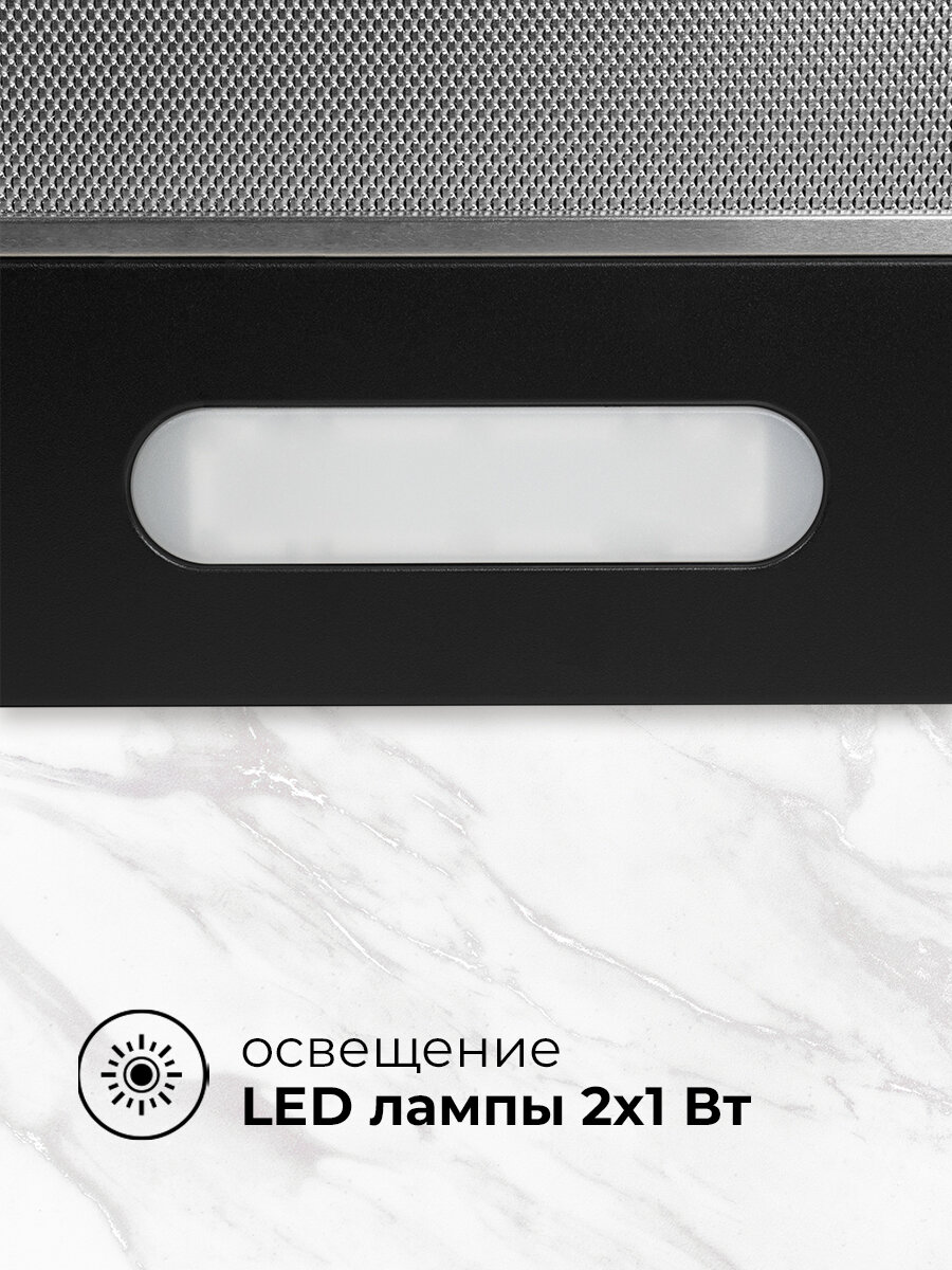 Встраиваемая конструкция LEX HONVER G 500 позволяет максимально эффективно использовать пространство на кухне и органично вписать вытяжку в общий дизайн. Черный цвет придает ей современный и стильный вид, который подойдет к большинству кухонных гарнитуров.